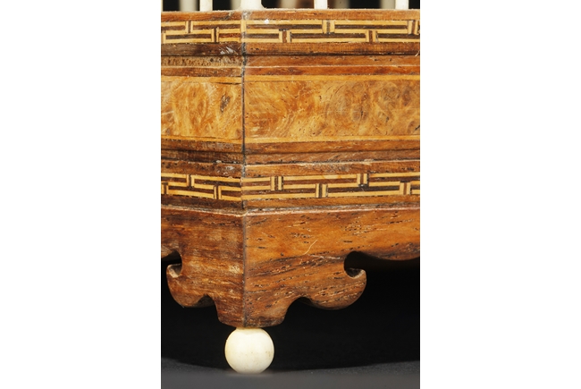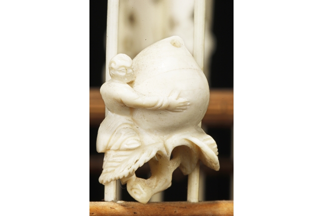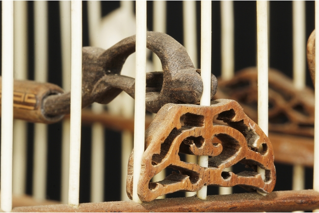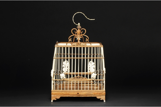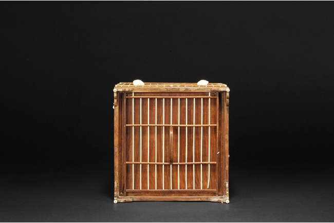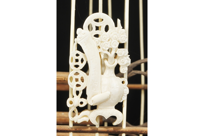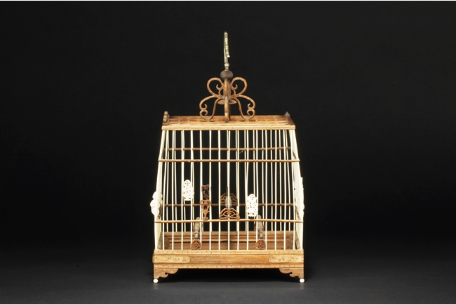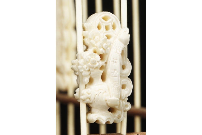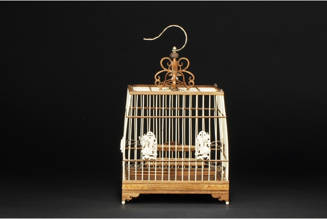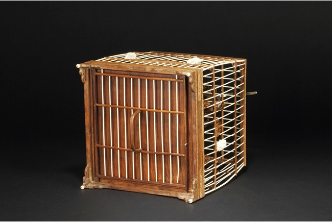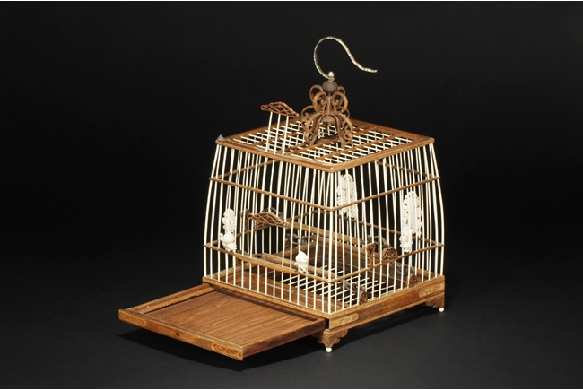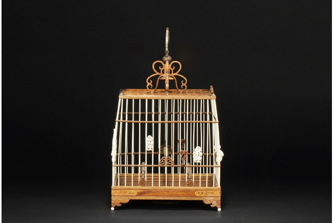 The cage of slightly extruding square form, the ivory making up the vertical cage bars, and bamboo making up the horizontal bars, the bottom with a sliding bamboo panel with handle, the top with a metal hook attached to a carved bamboo decoration, the sides attached with six carved ivory ornaments, and three bamboo bars within the cage. 19th century
