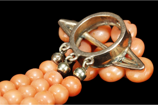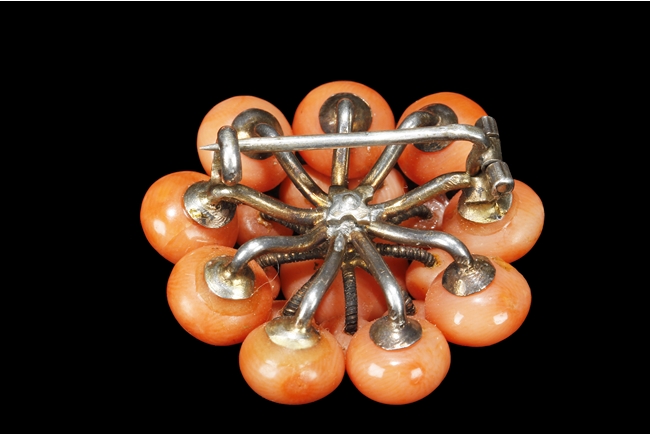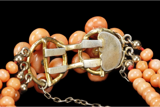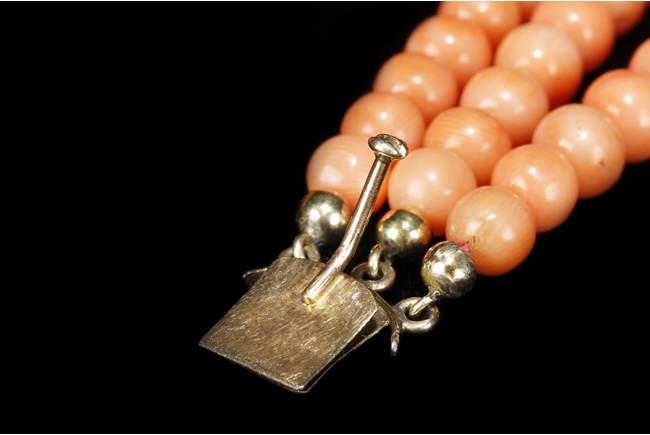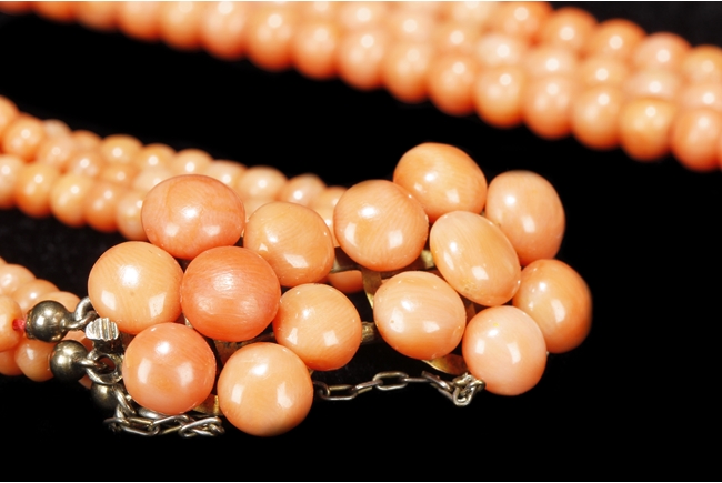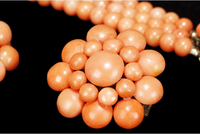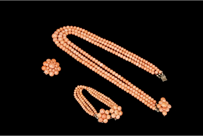 The set includes a three strand coral necklace, a three strand coral bracelet, and a coral brooch with beads formed into a blossoming flower, all coral beads with almost salmon color, size ranging from 5 mm to 10 mm, using 8k yellow gold for settings.