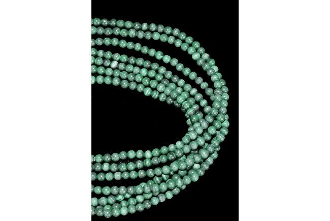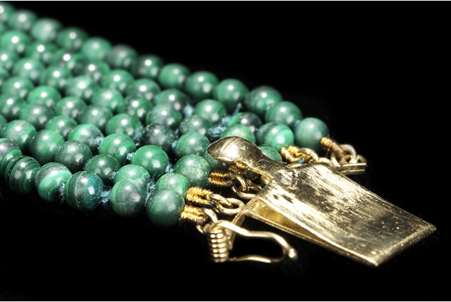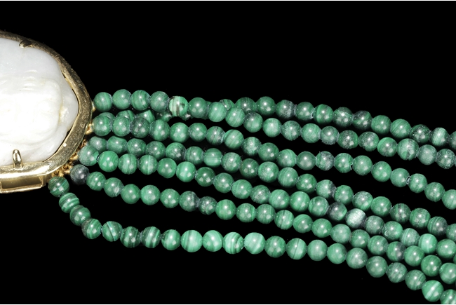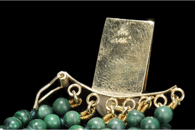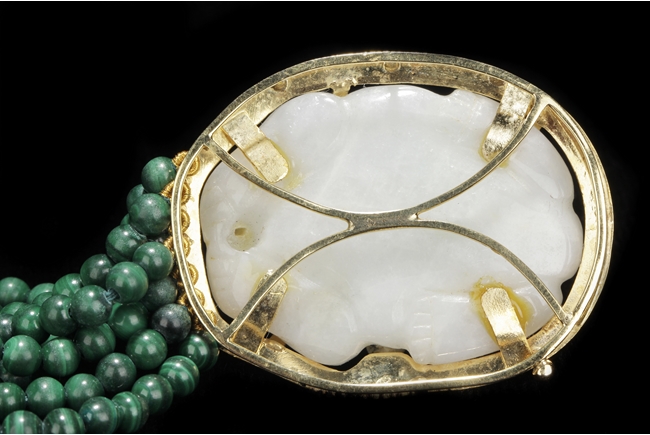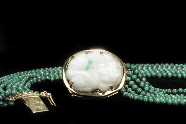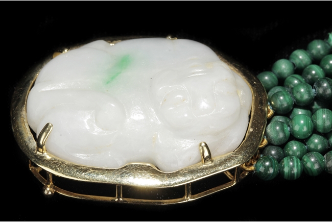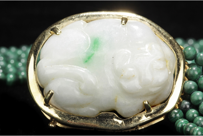 The necklace consists of seven strands of round bead malachite, in similar color and size. The jade pendant, framed by 14k yellow gold, depicts a mythical beast resting on all fours; the jade stone of white color with translucency and a splash of green.