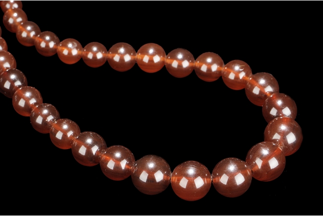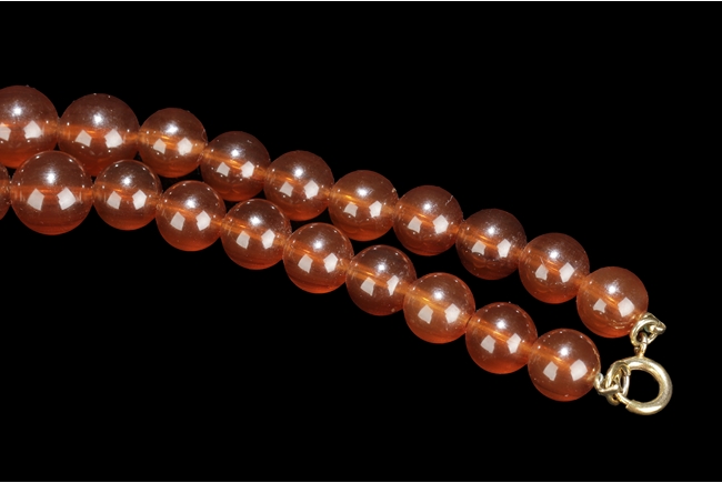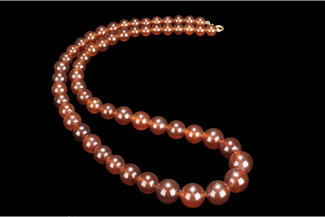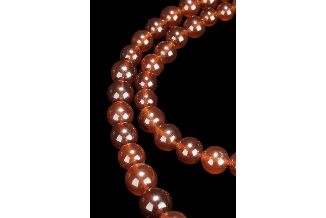 The necklace consists of 57 round amber beads, each bead with diameter ranging from 1cm to 2cm, with smooth, translucent, and evenly dark honey color. Total weight is 102 grams. 19th century