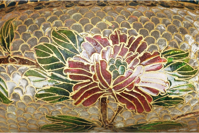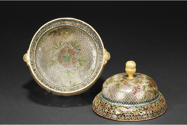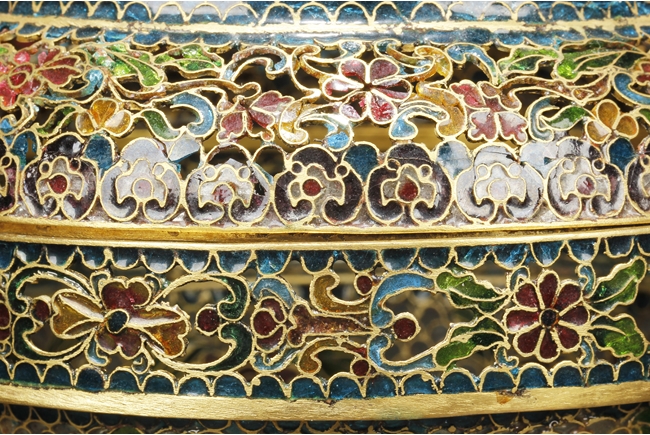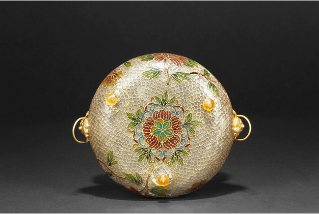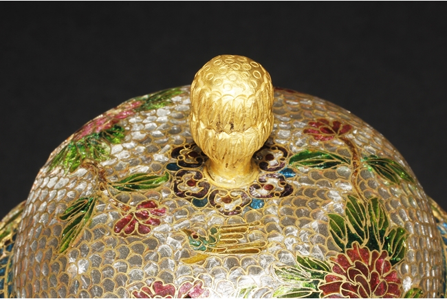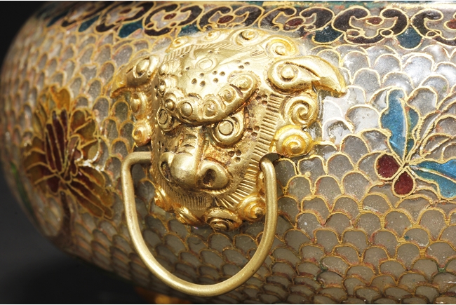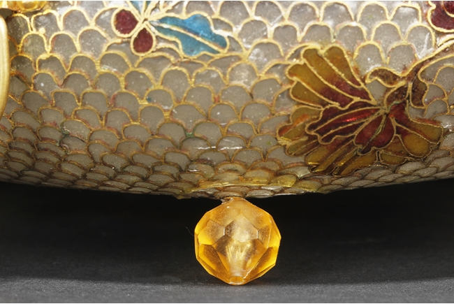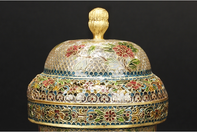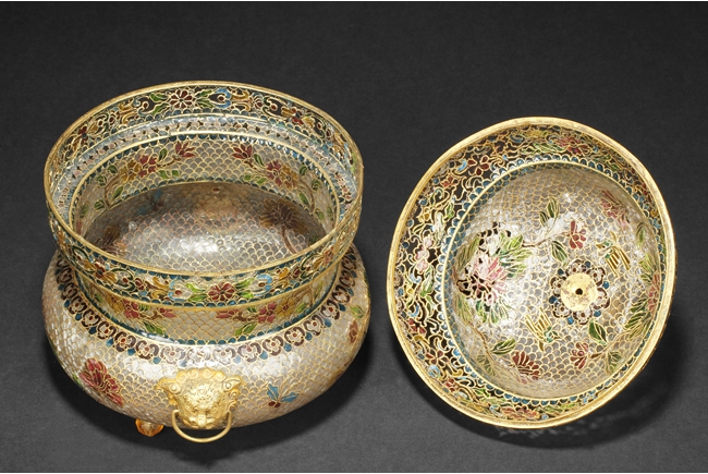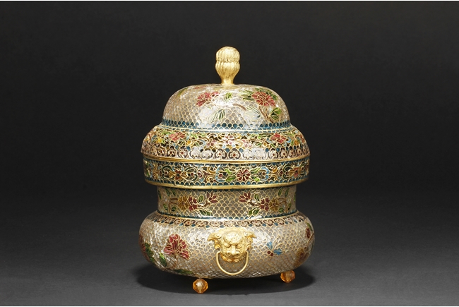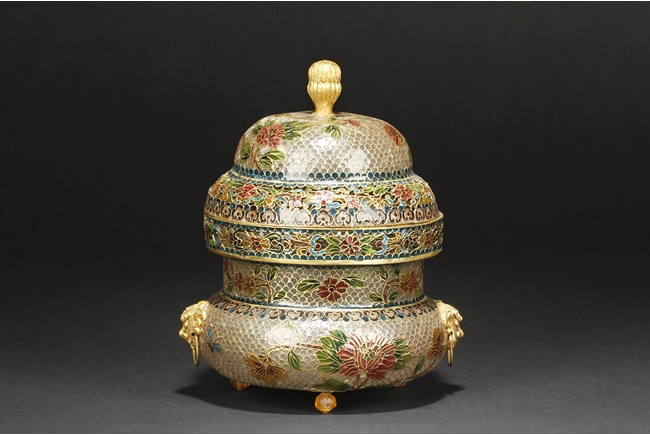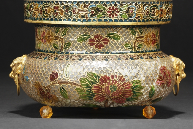 Of flattened baluster form, the censor supported by three small glass bead feet, decorated with flower and vine glass decorations on the body, with a pair of lion mask ring handles on the side, and a finial in lotus bud form on top. 19th century