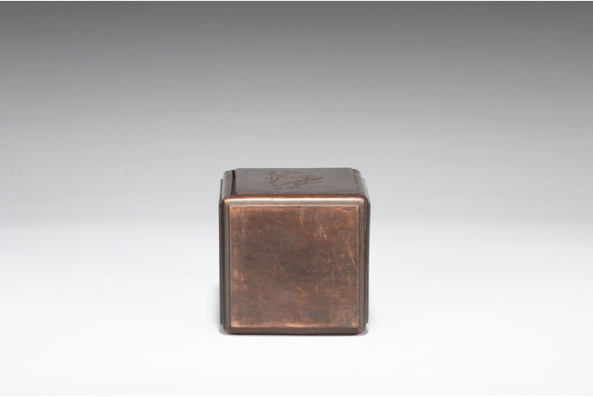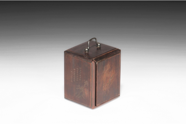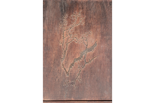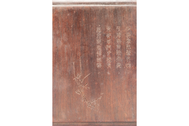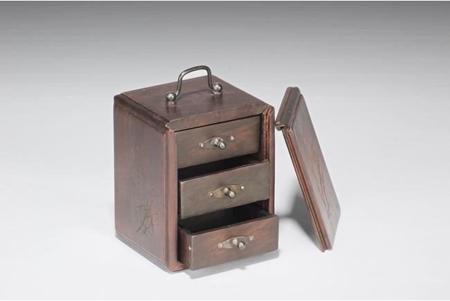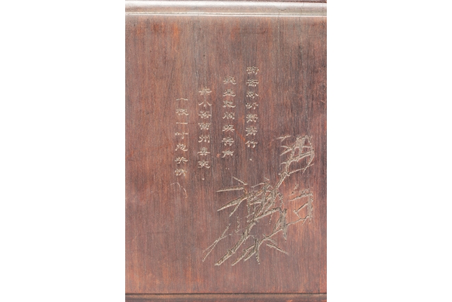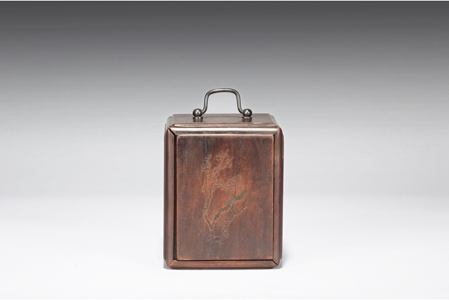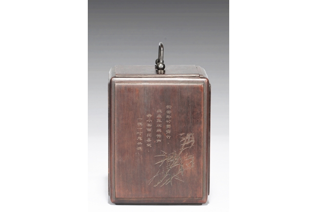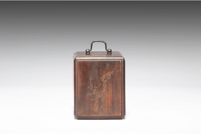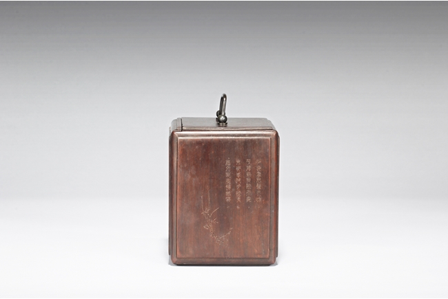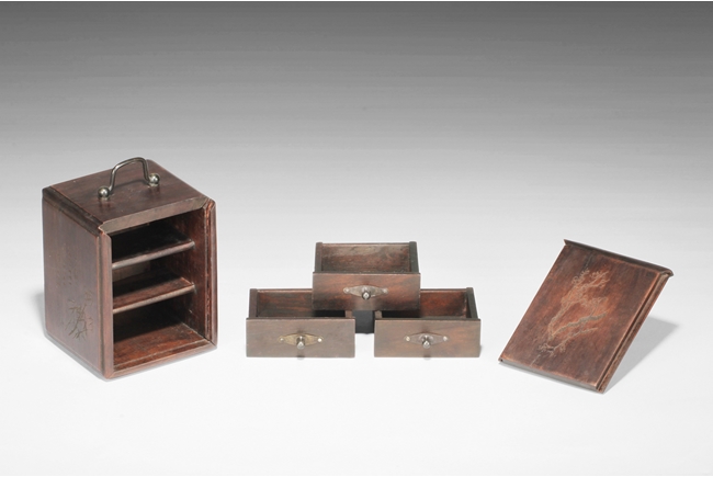 Of tall rectangular form, the wood with natural color and grains, the box carved on each side with trees and poems, one side slides out upwards, revealing three small drawers within, each with small round metal knob, similar in style to the handle on top. Qing Dynasty period