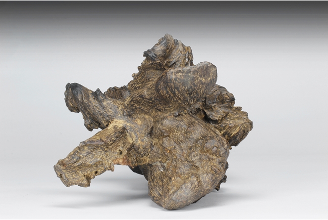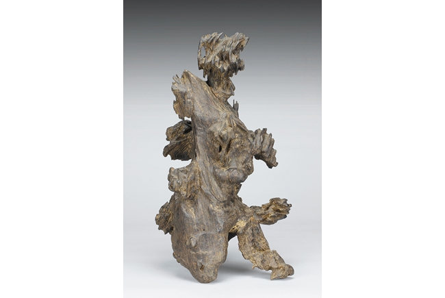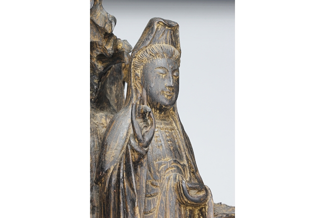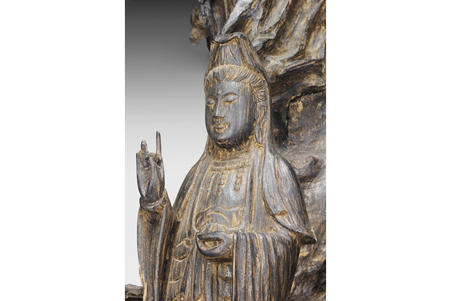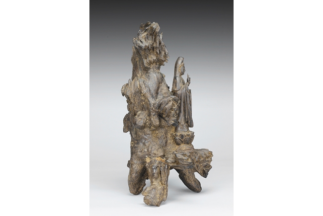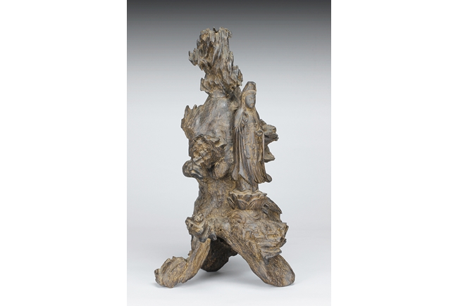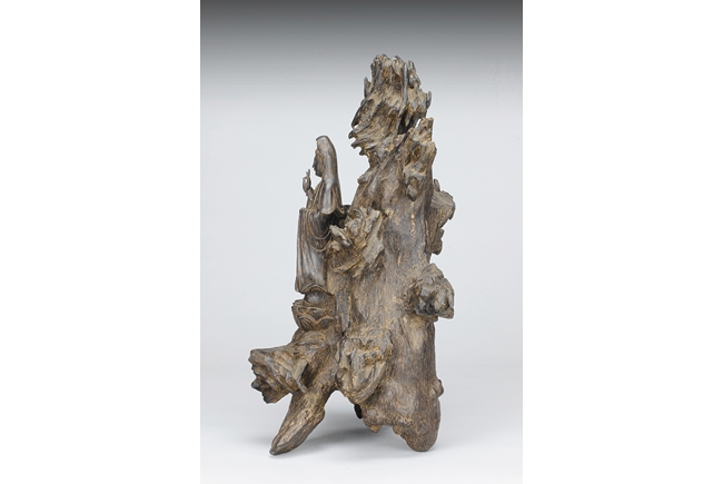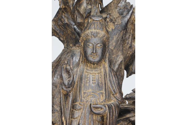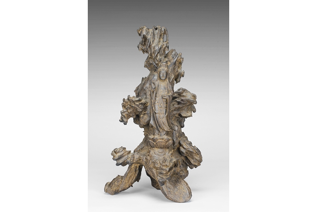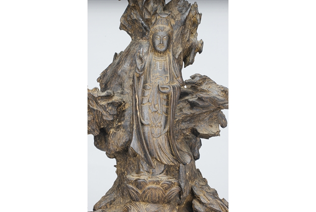 Carved from the trunk of sandalwood, the Guanyin stands on a double lotus flowers throne, wearing long flowing robes exposing beaded ornaments on the neck, eyes closed with serene expression, against naturalistic carved wooden backdrop. Qing Dynasty period