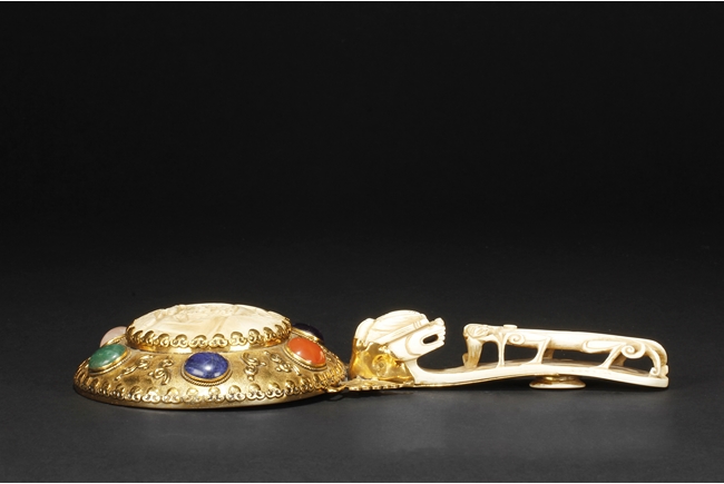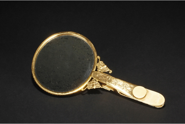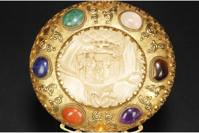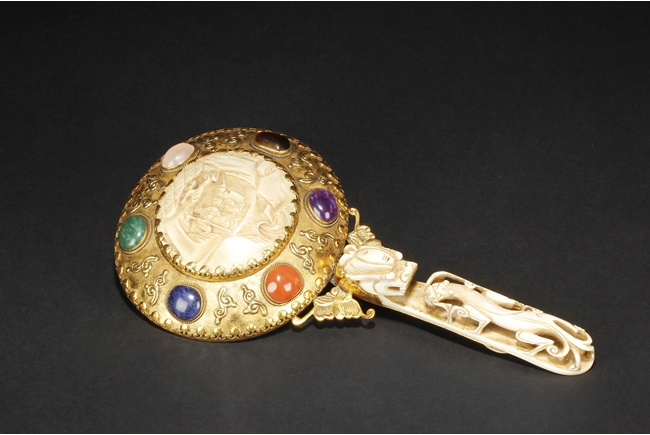The mirror of perfect round form, framed with gilt silver, attached to a gilt silver and ivory handle incised with flowers and leaves patterns, enforced by two flying gilt-silver bats, the reverse side ornate with six different semi-precious stones such as la pis lazuli, malachite, agate, and more, the center holds a carved ivory roundel depicting an elder and child in a forest setting, the backside of handle attached with an ivory head-hook of an elder chi-long confronting a young chi-long. 19th century