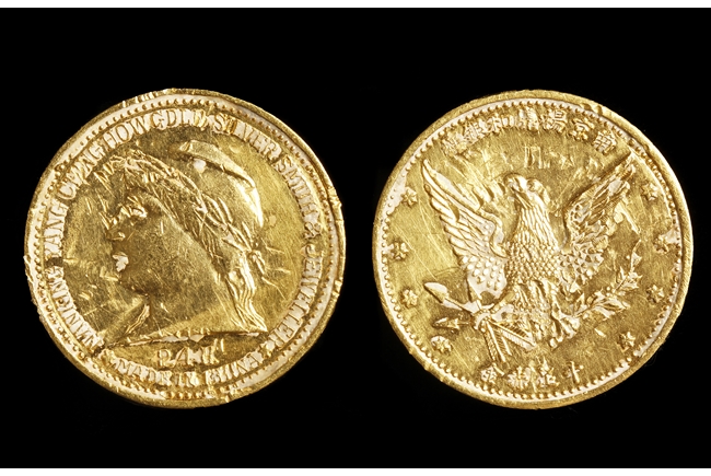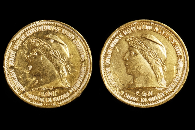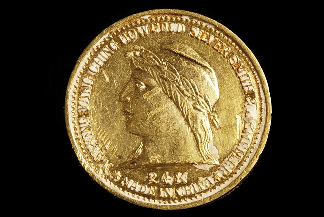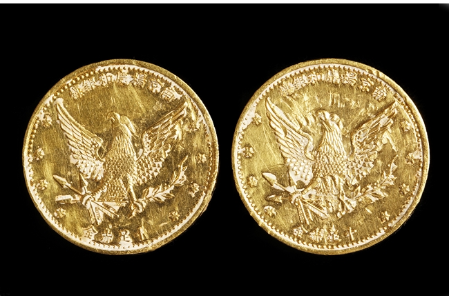 Two finely minted vintage Chinese 24k gold coins with the same design,the front with a Greek man portrait with olive branches, encircled by English “Nanking Yang Ching How Gold Silver Smith & Jewelry, Made in China, 24k”, the reverse with an eagle holding arrows in one claw and flower branches in the other, Chinese characters mark “NanJing Yang Qing He Jeweler’s Shop“ neatly engraved above the hawk, and full 24 k mark in Chinese below the hawk.