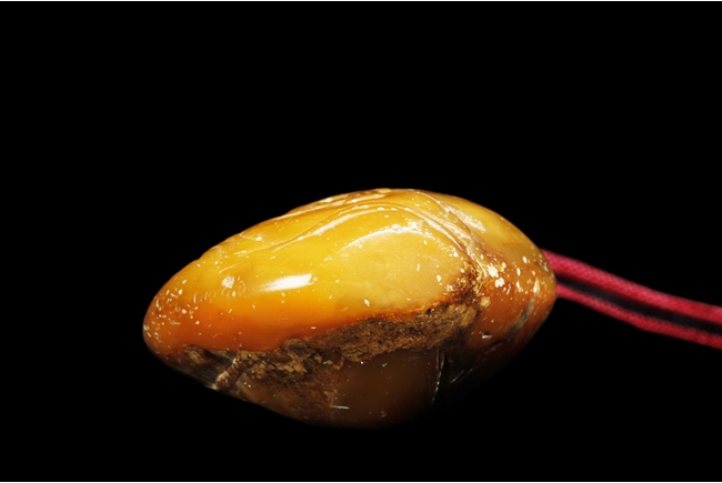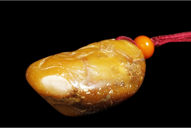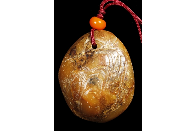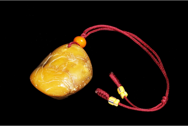 The stone of natural honey color, one side carved with two elders fishing under pine trees, the other side carved with mountain and forest scenery. Small russet patches and natural imperfections on the surface. Qing Dynasty period