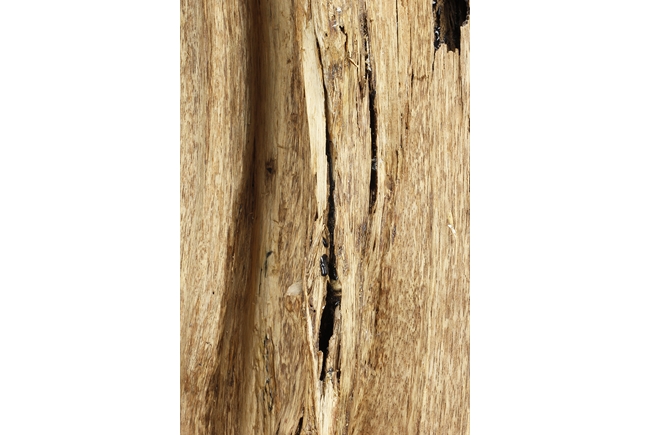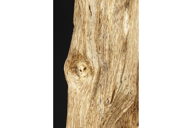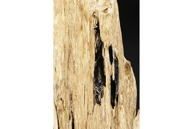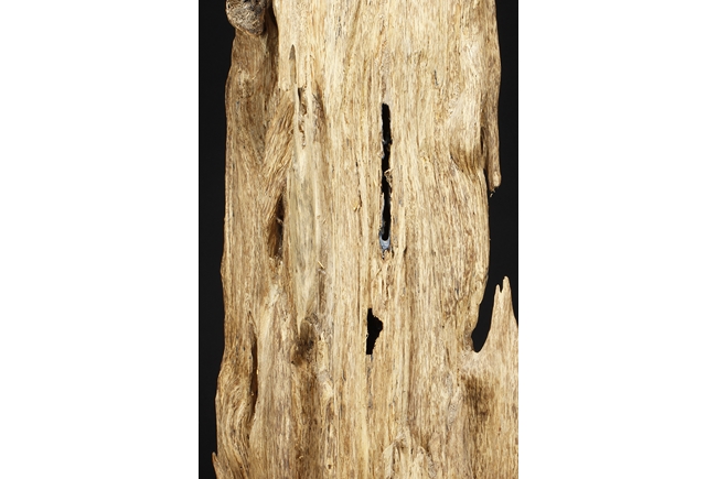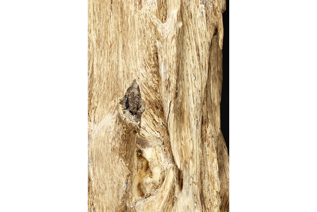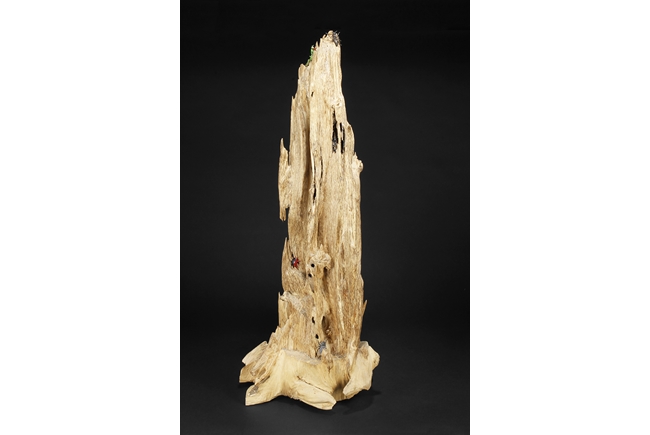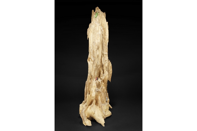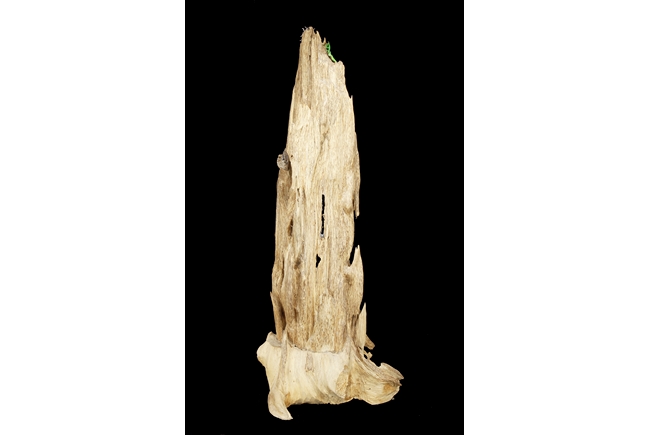 The agar-wood trunk in naturalistic shape, with tree bark missing on the top, showing natural age and wear. Multiple decorative bugs on the tree trunk.