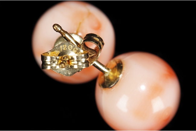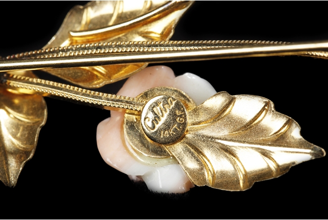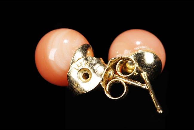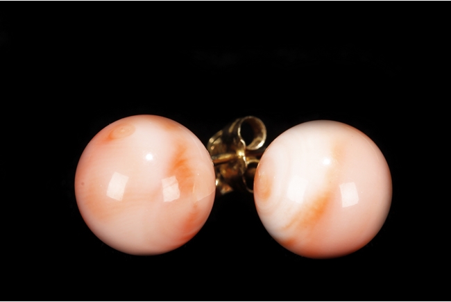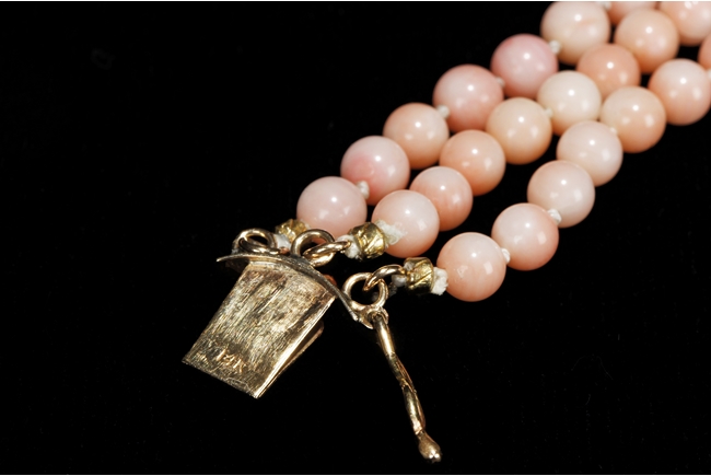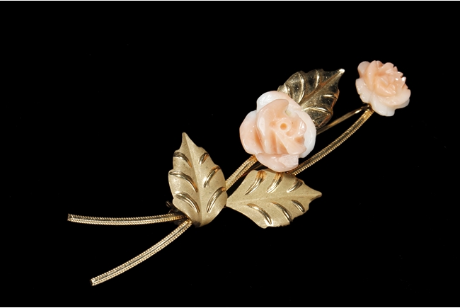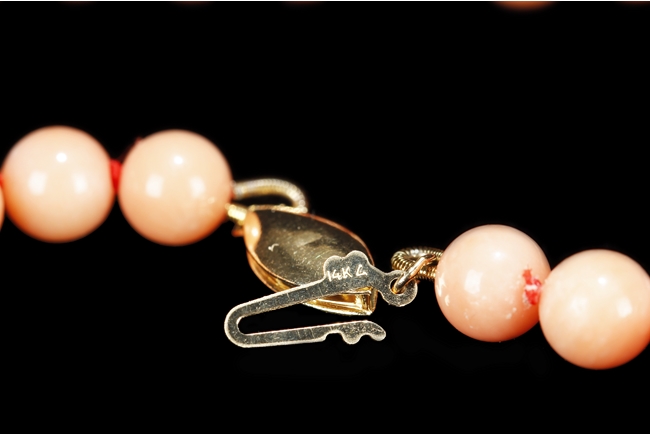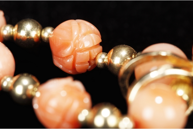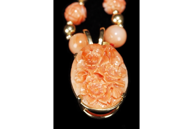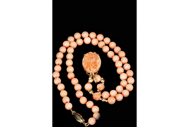 The group includes two sets of coral jewelry. One set includes triple strand coral necklace with larger coral pendant, brooch with coral carved in rose form, and a pair of round bead coral earrings, all with 14k gold settings and angel skin pink color. The other set includes a 6mm bead single strand coral necklace with oval coral pendant carved with rose flowers, and a pair of 6mm round bead coral earrings, all with 14k gold settings, and coral with almost salmon color.