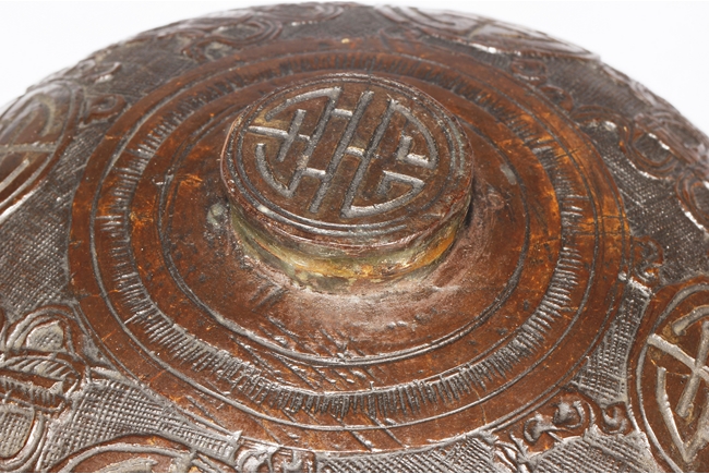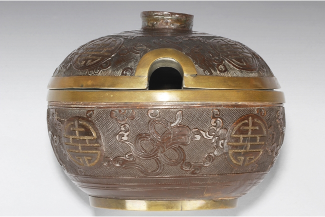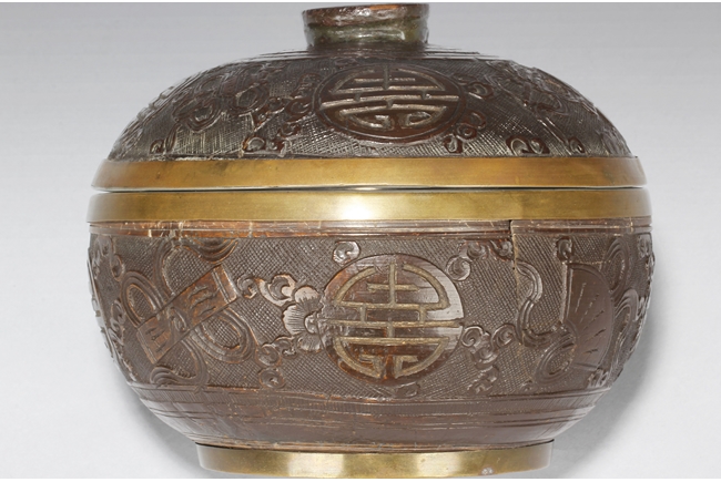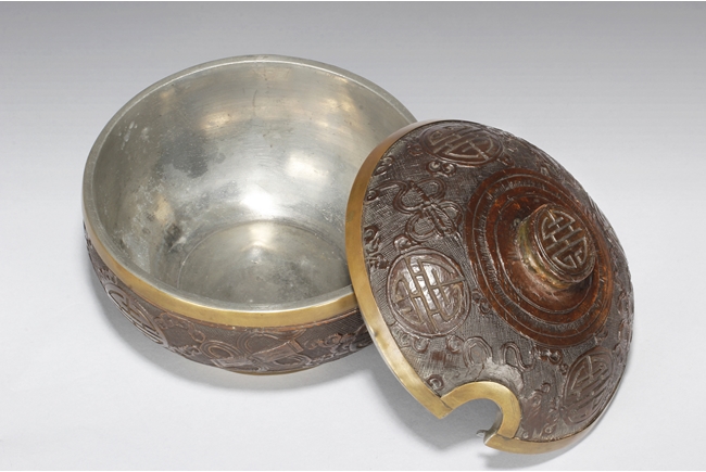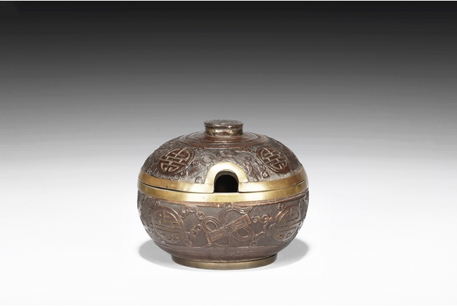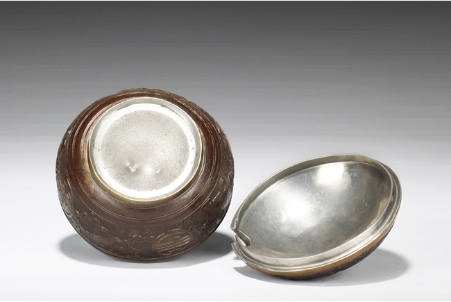 Of globular form, the exterior lightly carved with Chinese characters “Shou” in-between auspicious symbols, the interior and bottom inset with tin, and the outer frames on the rims inset with bronze. Qing Dynasty period