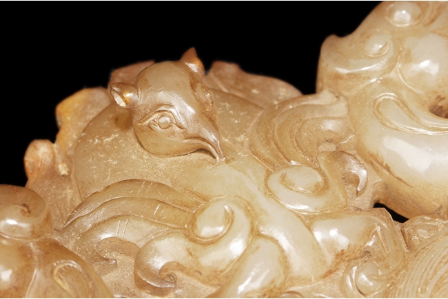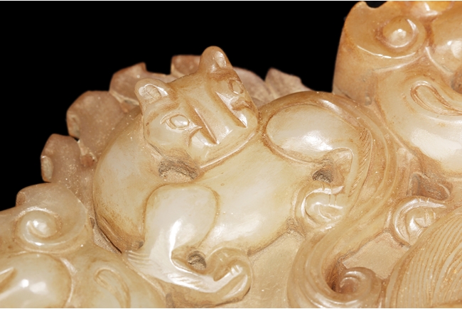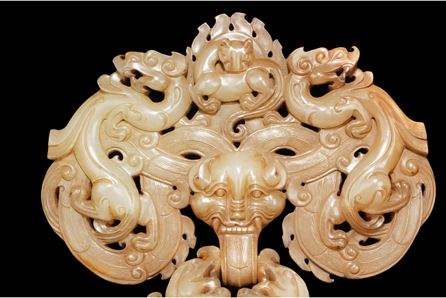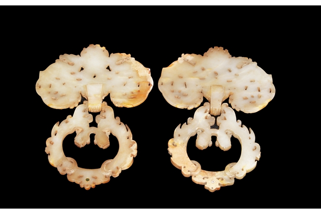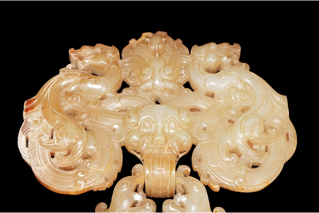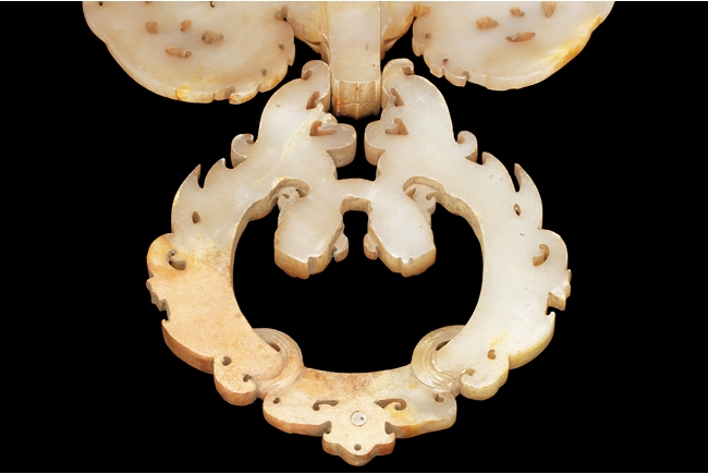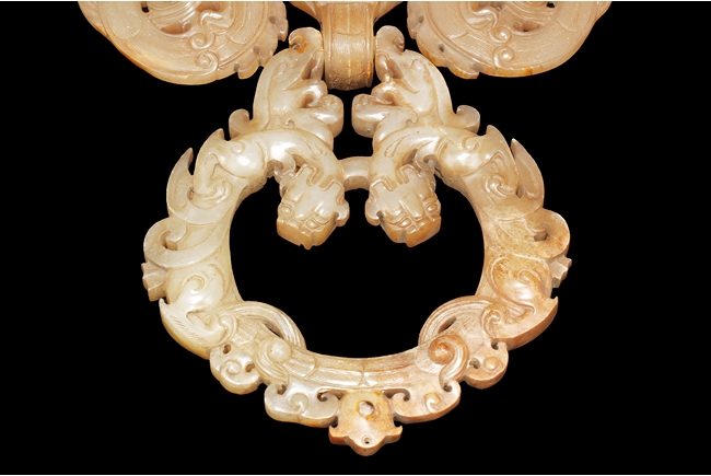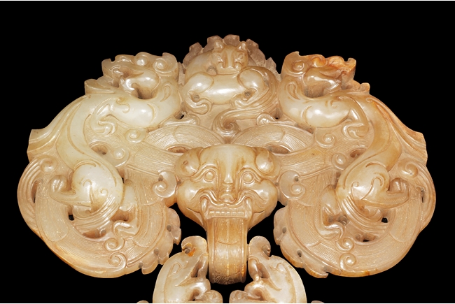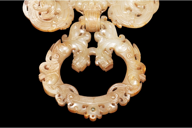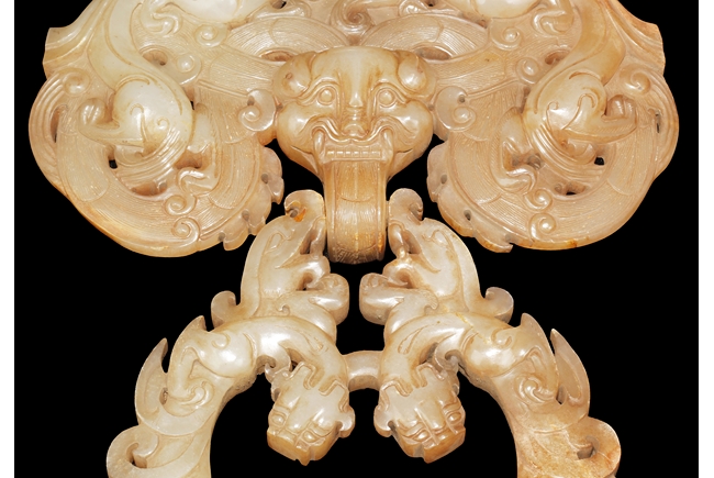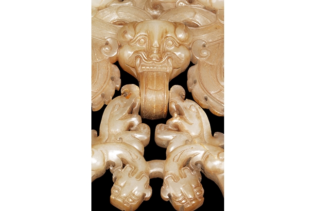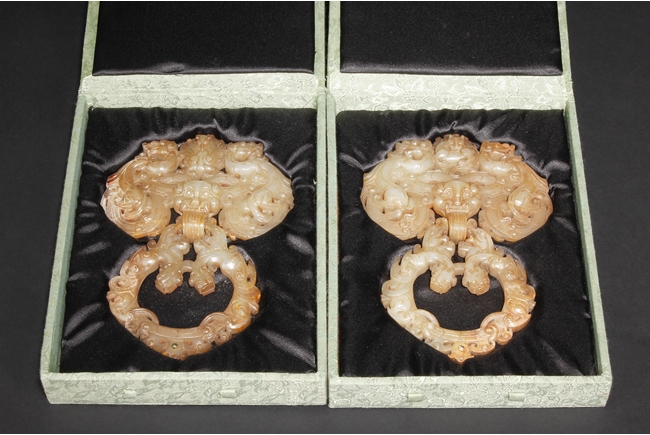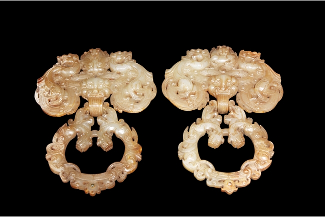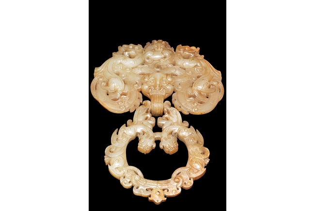 The backplate carved with three chi-long on the top, a center chi-long attached with the handle depicting confronting chi-long, the door knocker ornament made from brownish-grey jade.