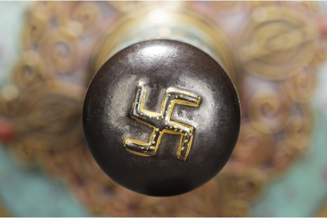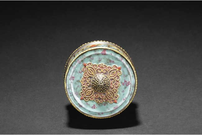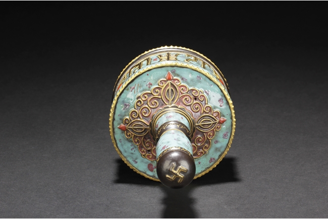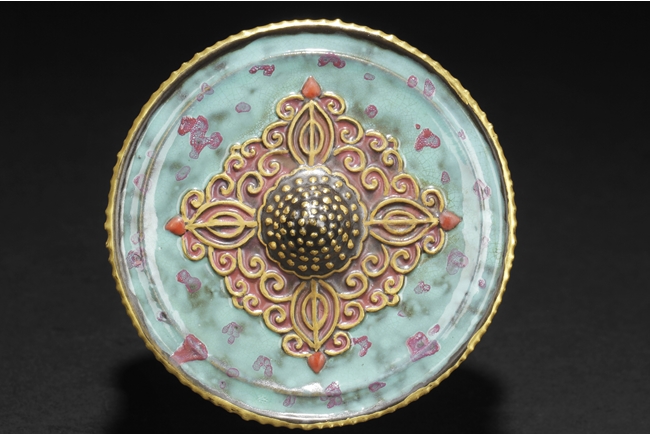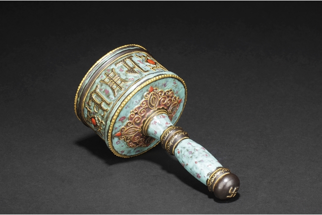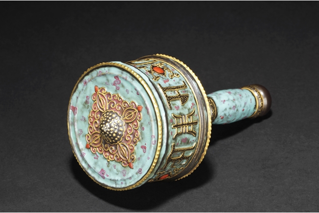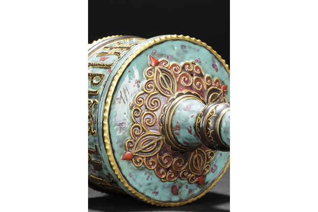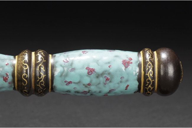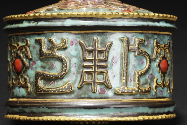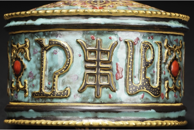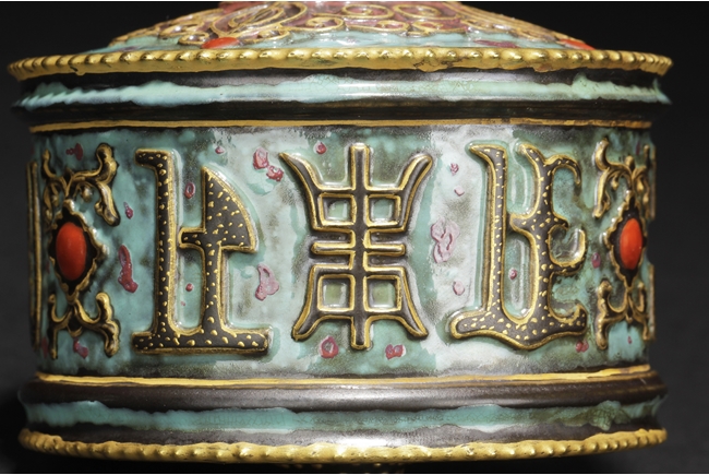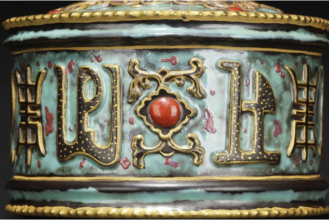 Imitating the design of cloisonne enamel ritual instrument, the ceramic piece with gilt and extruding designs and text, teal ground, and ritual symbols. Qing Dynasty period