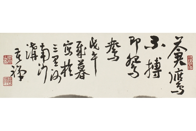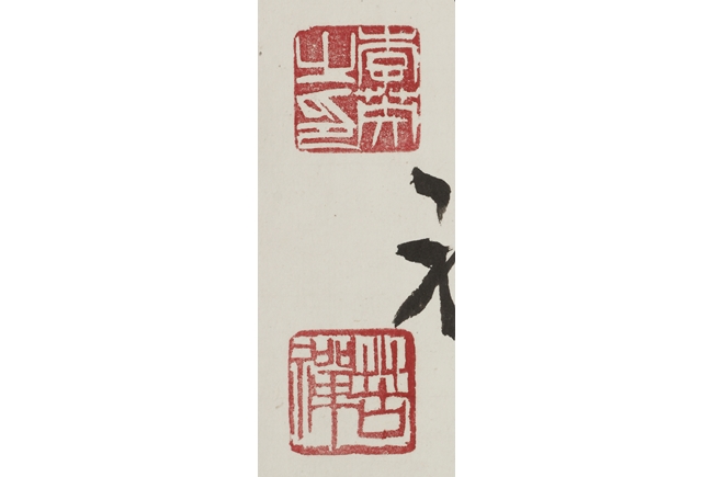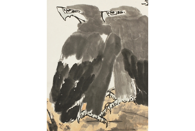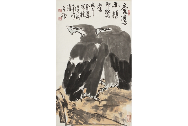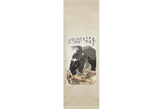 Color and ink painting on paper, hanging scroll. The painting depicts two eagles situated on rock ledge, looking towards the same direction. Chinese colophon, artist signature and mark “Li Kuchan” on the top.