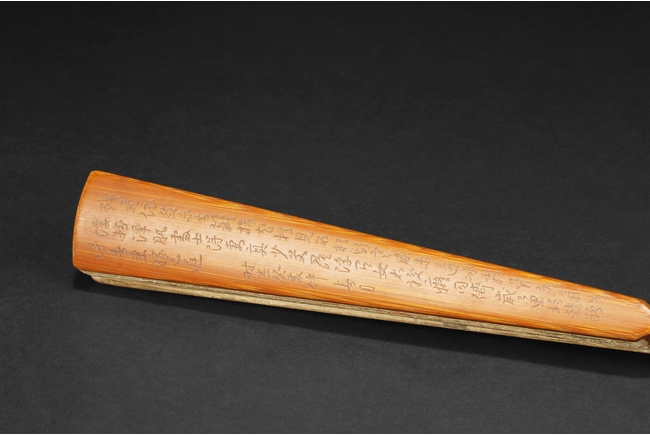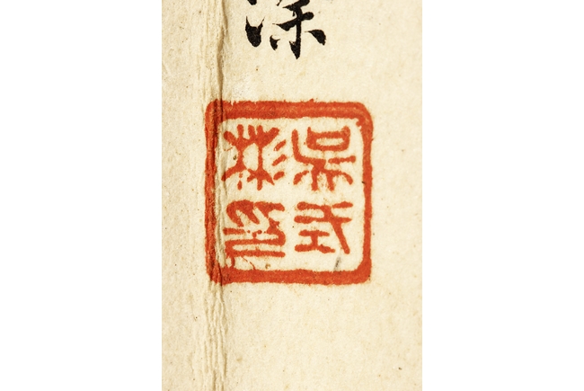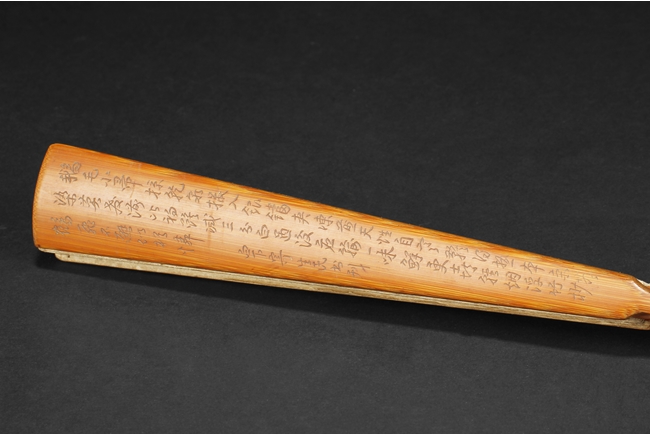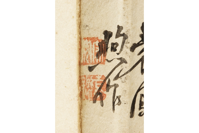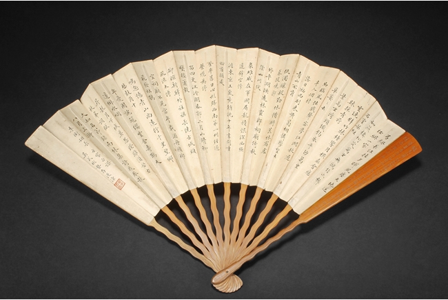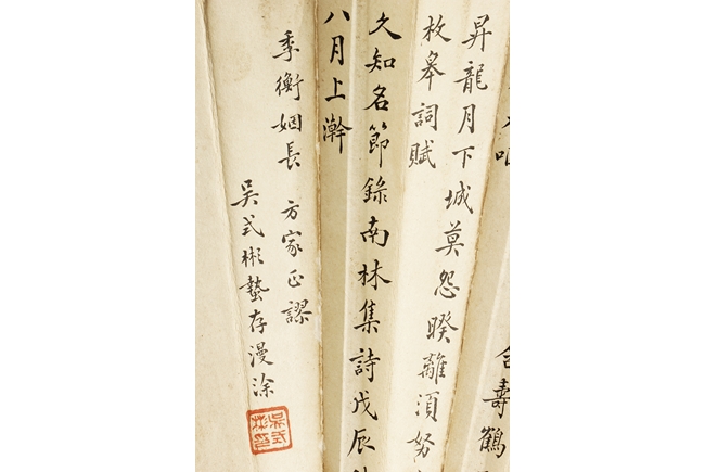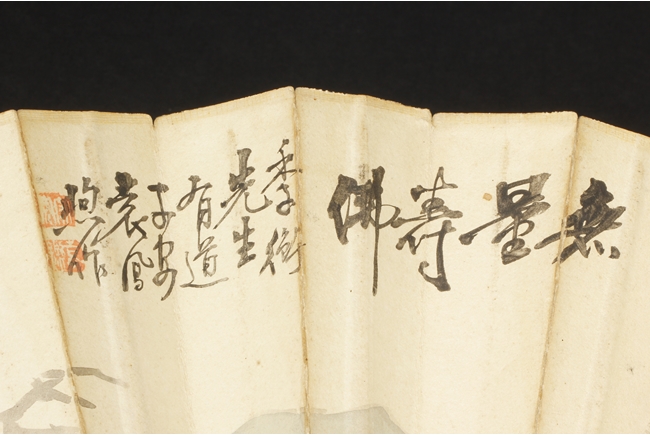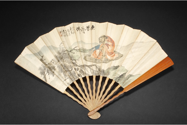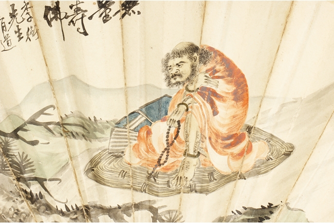 Color and ink on paper, one side of the fan surface painted with a seated Amitayus in contemplative pose on the mountain, one hand holding prayer beads, a stack of books next to him, gazing towards the mountains; colophon, signature and seal marks on the top. The other side written Chinese calligraphy by Wu Shibin, signature and artist mark on left side. Additional Chinese carved on the end sticks.