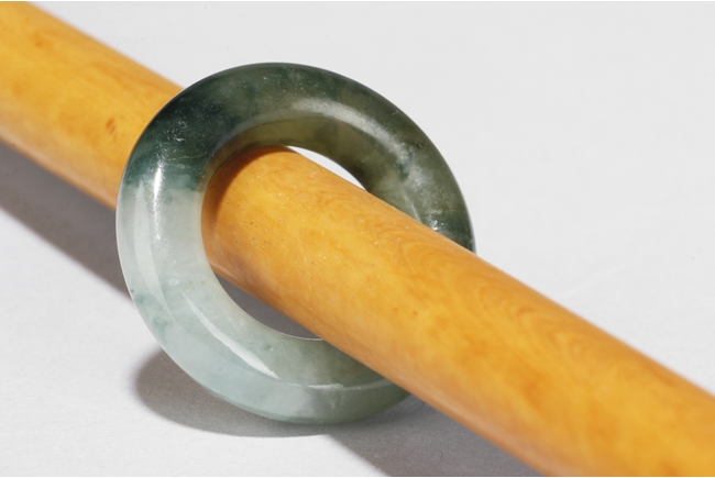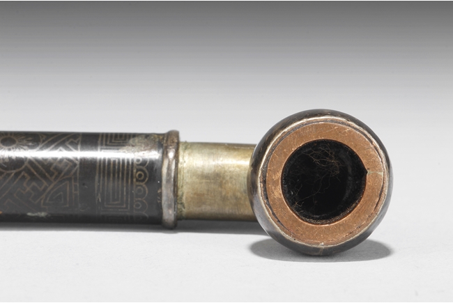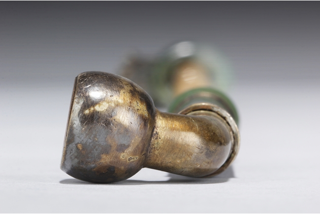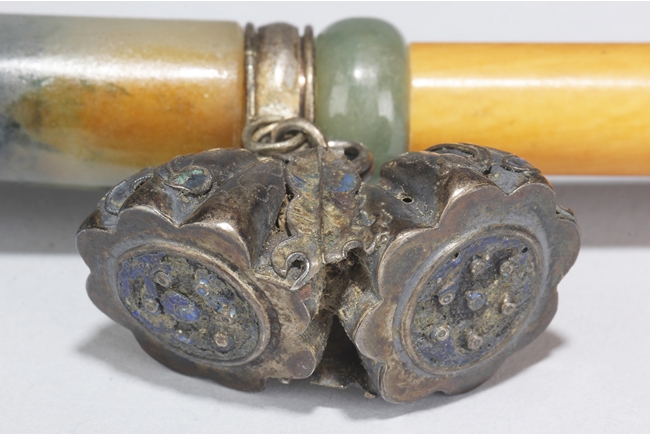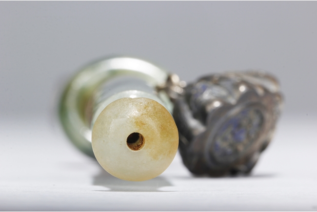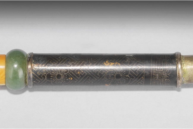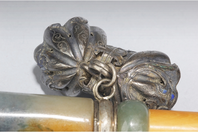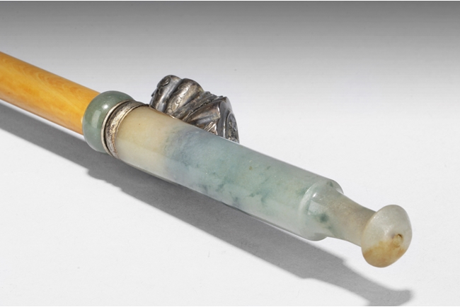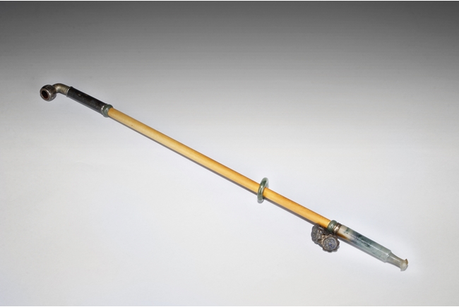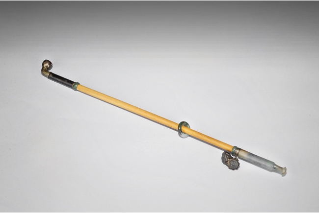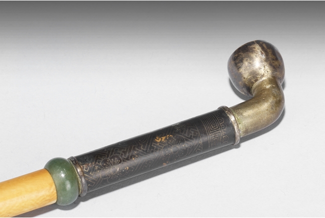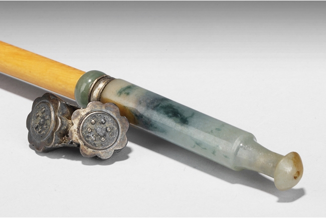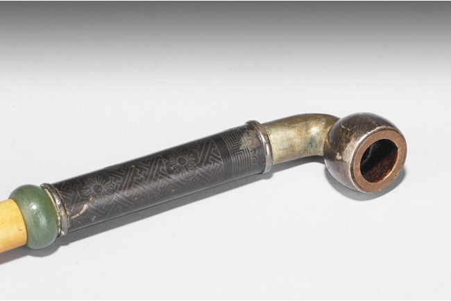 The long smoking pipe’s mouth piece is made of hollowed jadeite, the stem is made of ivory, the shank and bowl made of metal. Additionally, a small lotus pod shaped metal weight hangs near the mouth piece, a sliding jadeite ring over the ivory stem, and the shank decorated with flowers amidst rectangular patterns. The jadeite stone of white and green color, with slight russet. Qing Dynasty period