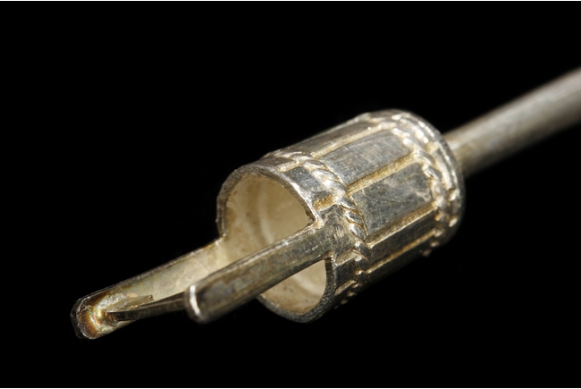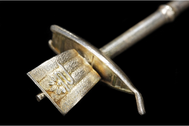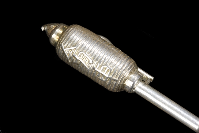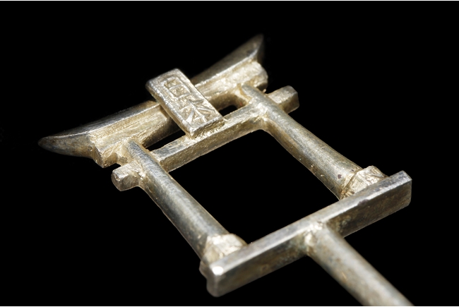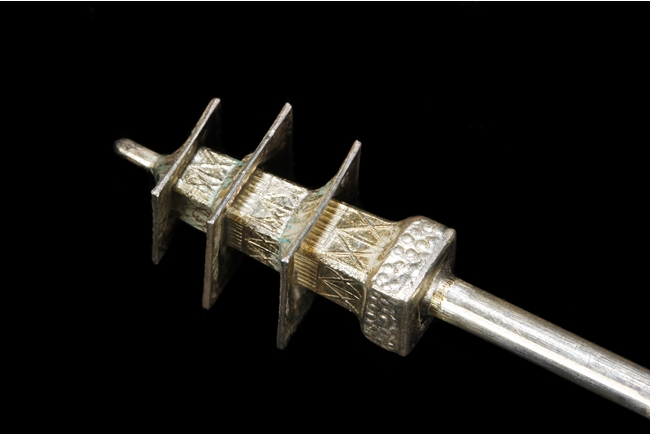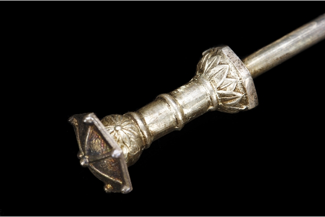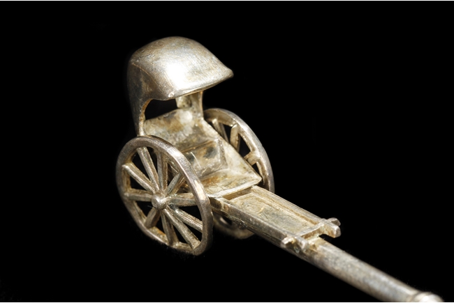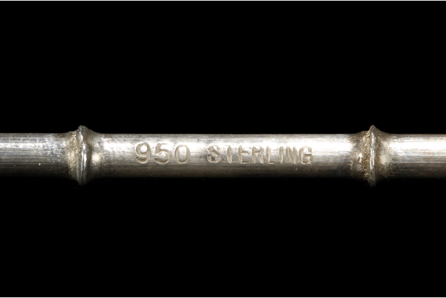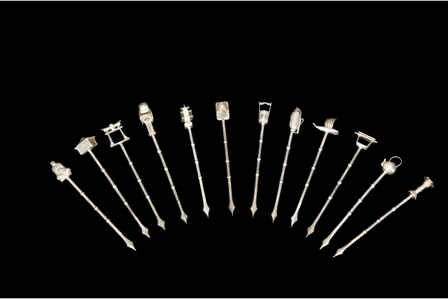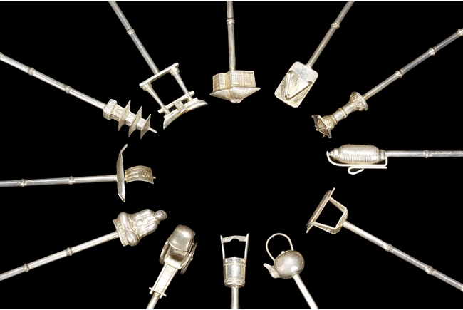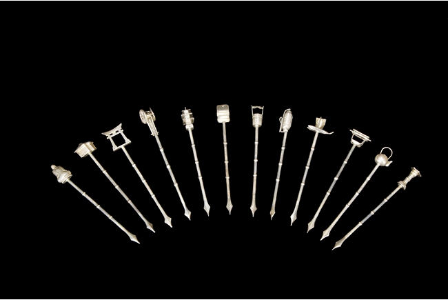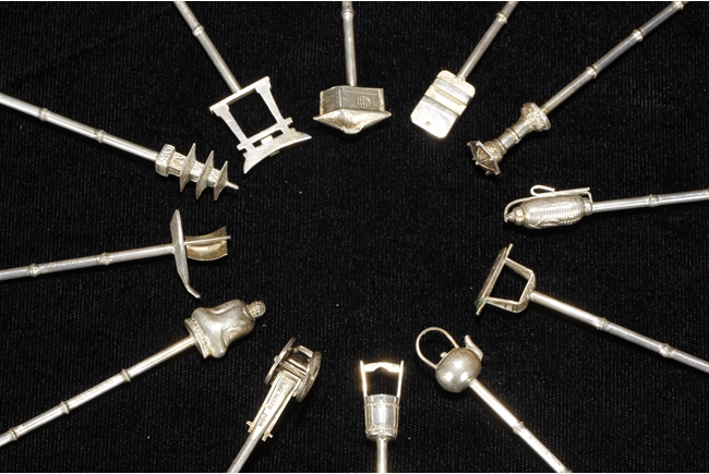 The set of silver utensils each with a spear-like tip, with bamboo sectioned handles, and on the top adorned a different symbol, including Buddha, house, gate, pagoda, and more. Marked 950 Sterling.