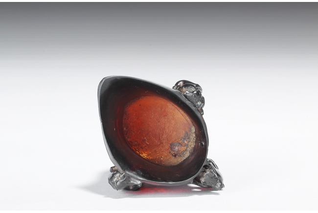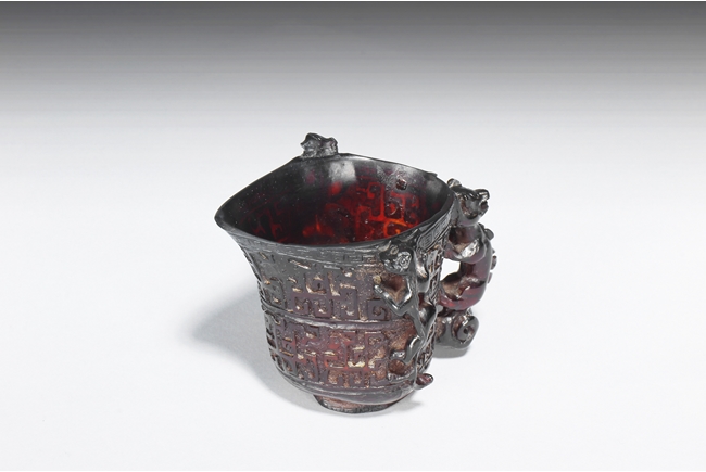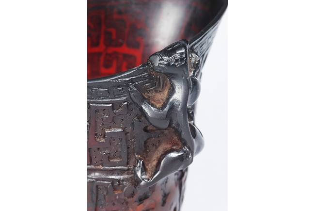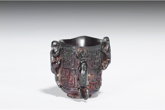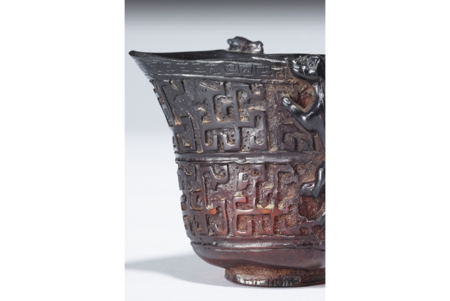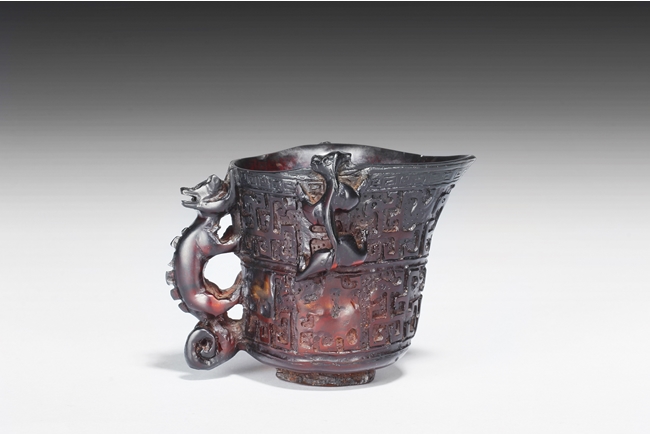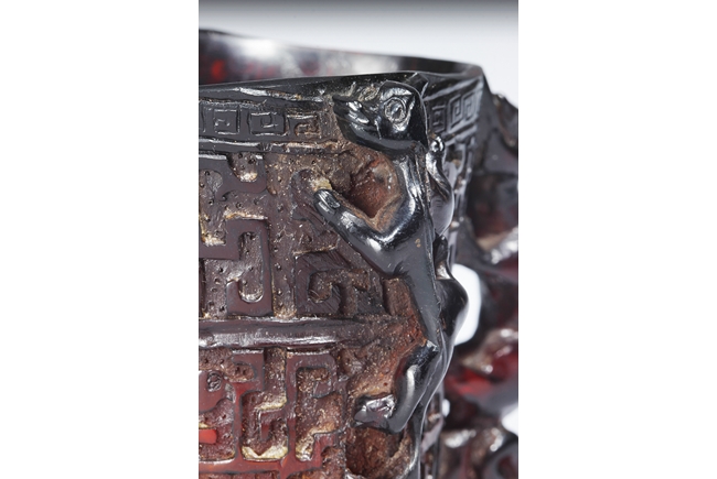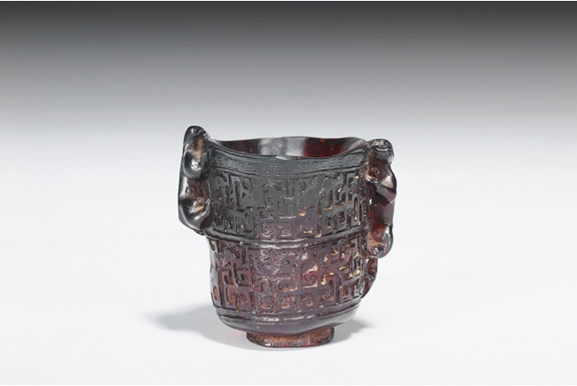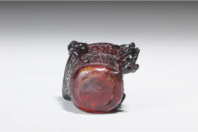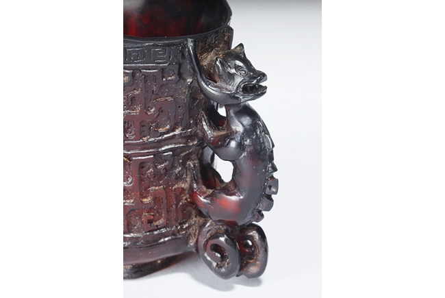 Finely carved on the sides with two smaller dragons climbing on the patterned surface towards the rim, a larger dragon with head turned around carved in open work acts as the handle, the rim and base with scrolling key-fret patterns. The amber of dark red color with translucency. Qing Dynasty period