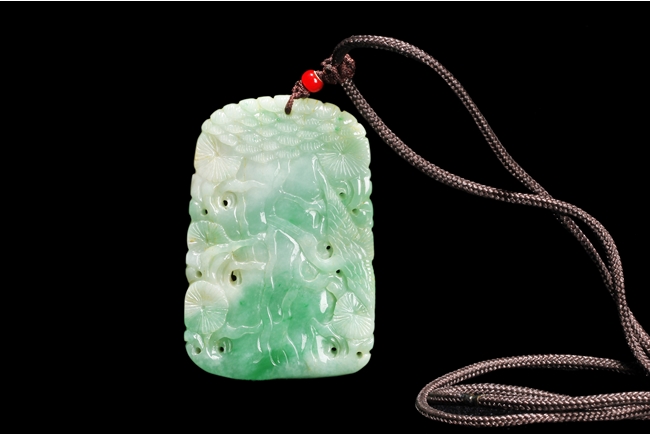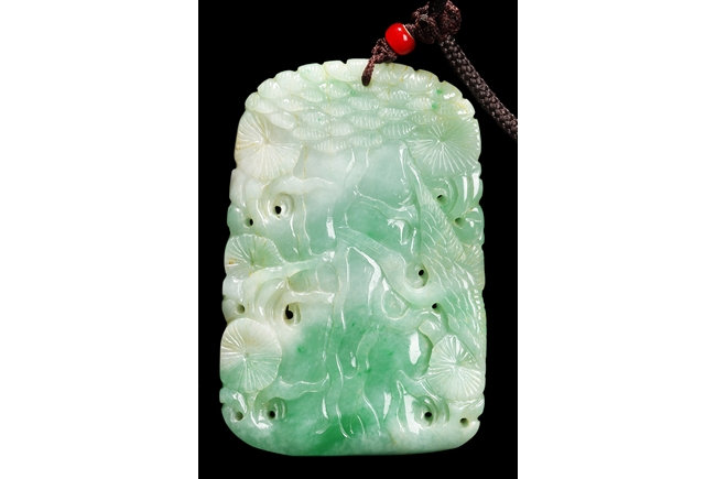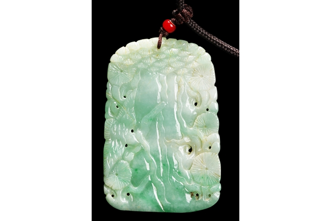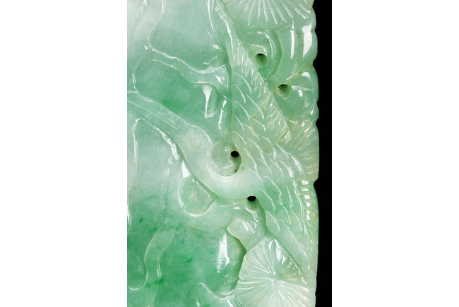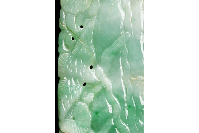 Of rectangular form with rounded top, the stone of mostly apple green and white color with translucency, both sides carved with a crane flying through dense pine forest. A few small pierced-through holes exist, as well as age related small imperfections. Qing Dynasty period