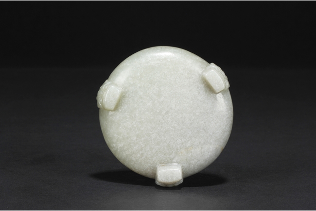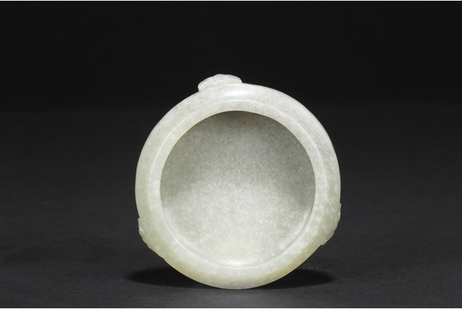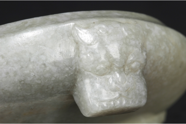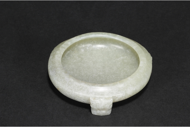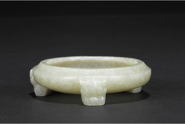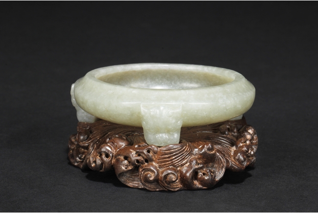 Of flattened ovoid form, the small washer stands on three beast mask legs, over original wood carved ocean wave patterned stand, the Hetian jade stone of mottled grayish-green color. Qing Dynasty period