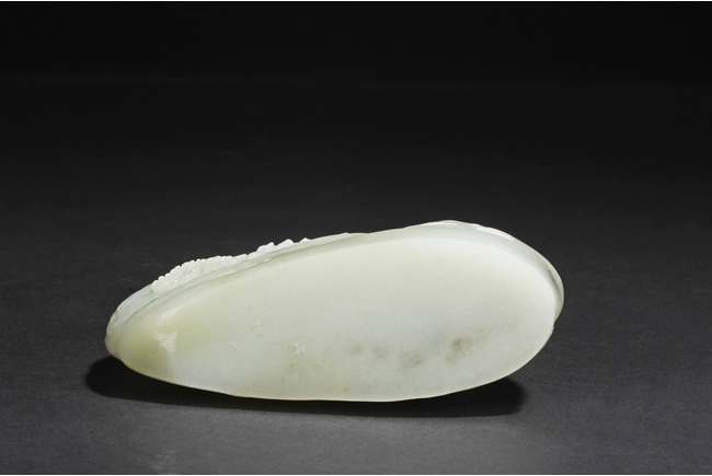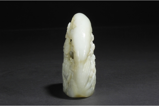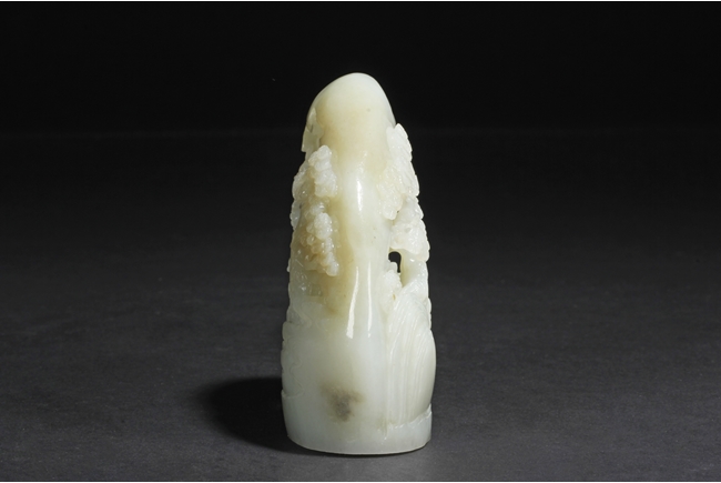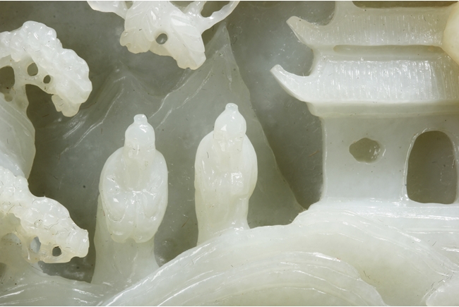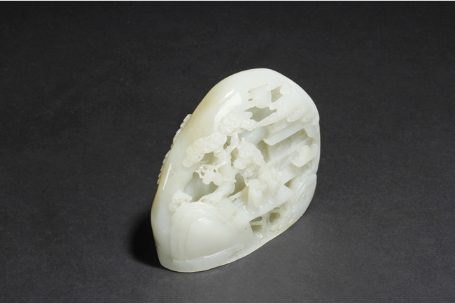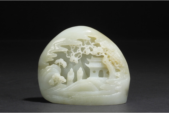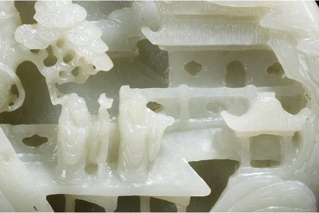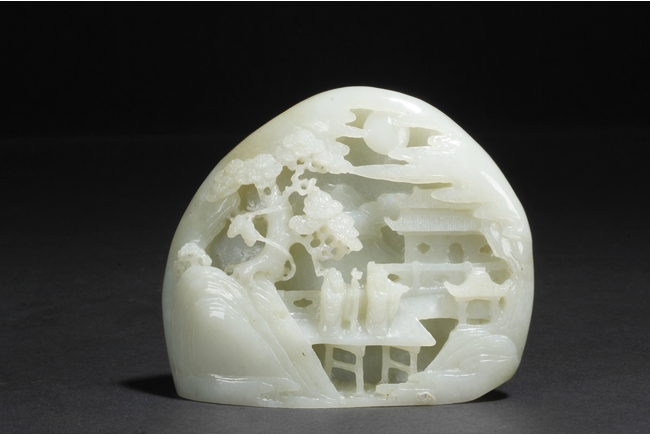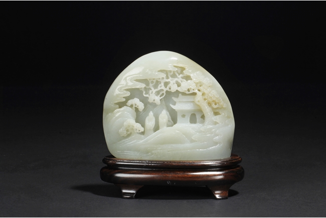The white jade boulder pierce carved on both sides, one side depicts two elders walking across the bridge under pine trees and clouds toward a pavilion, the other side depicts two elders near a building hidden amongst pine trees and mountains; the stone with white color and a slight hint of russet. Includes a stand. Qing Dynasty period