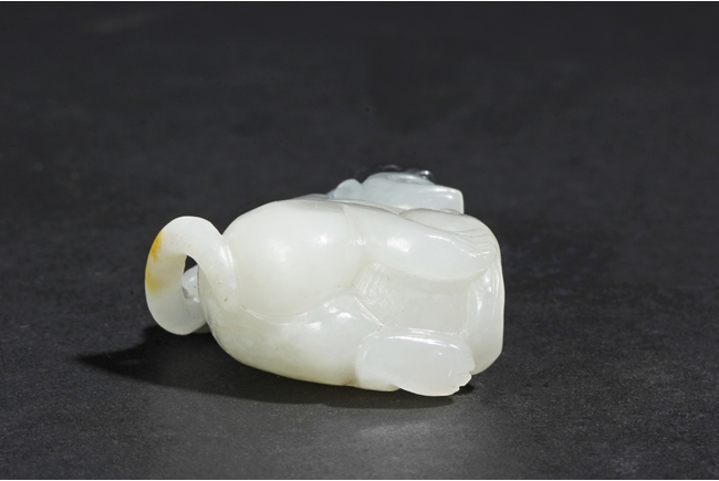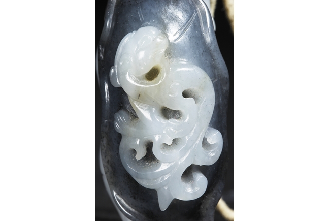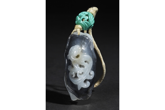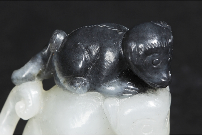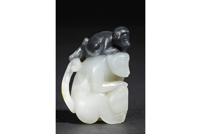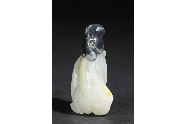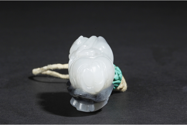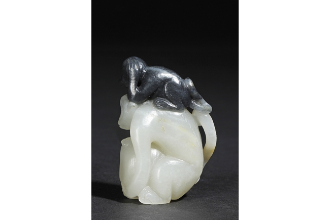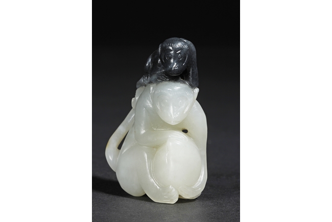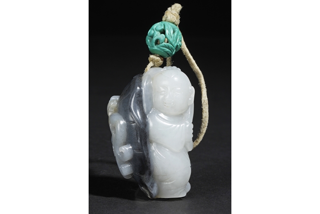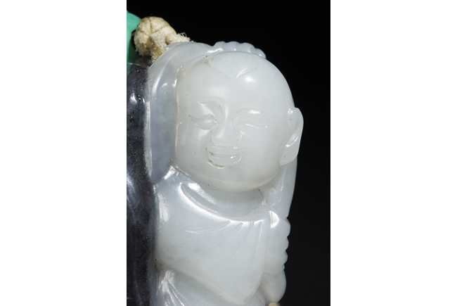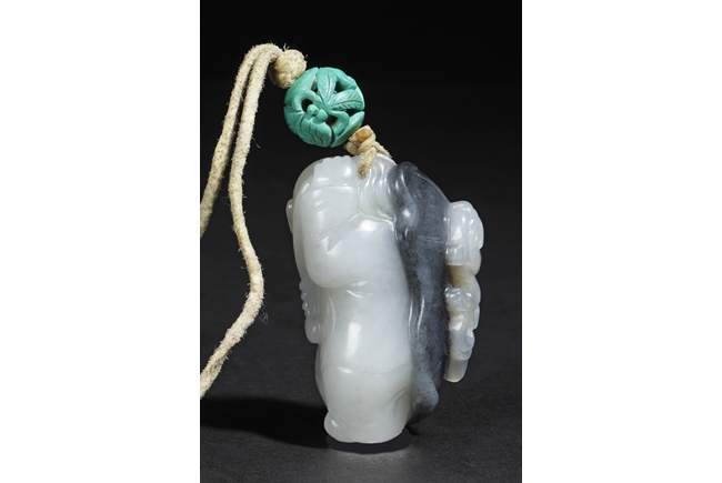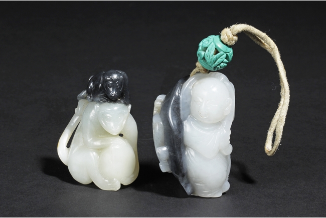 One ornament depicts a seated monkey holding onto a ball, while a small monkey surmounted on top, cleverly carved and fully utilizing the black and white jade. The other ornament depicts a young boy carrying a large lotus leaf on the back, with a small chi-long hanging on to it, cleverly carved, the string attached to a carved turquoise ball. 19th century
