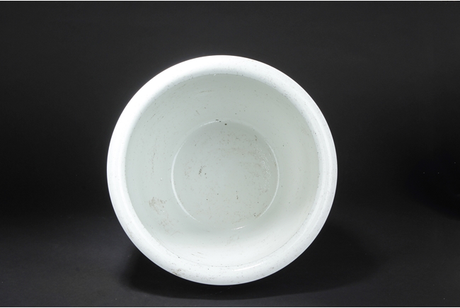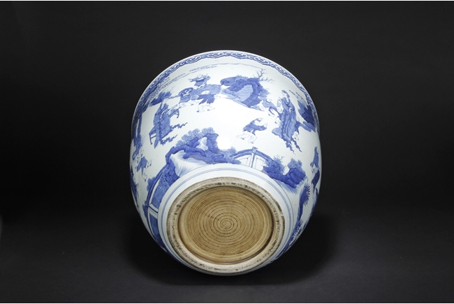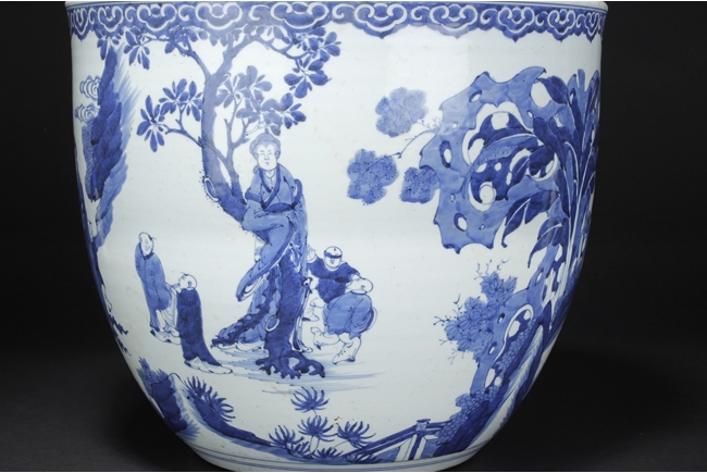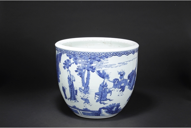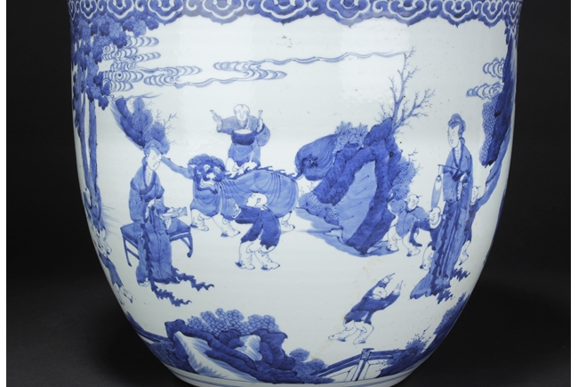 Of tapering cylindrical form, the jardiniere’s exterior painted in under-glazed blue a scene of mothers playing with children in a garden setting during festivities, including games such as lion dance, hide and seek, and reading book, all under scrolling ruyi head band pattern at the rim, the interior glazed white, and the base unglazed. Qing Dynasty, Yongzheng period