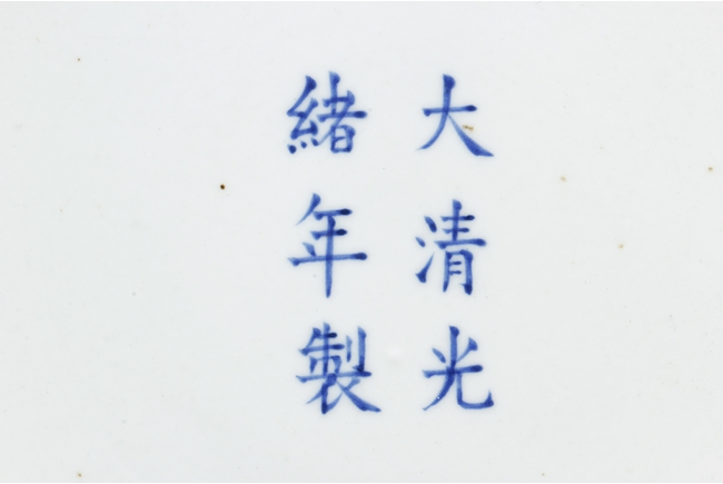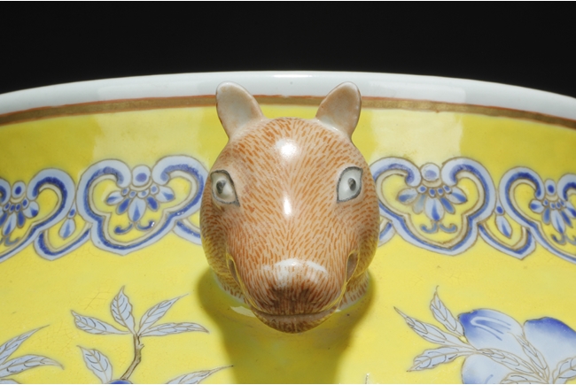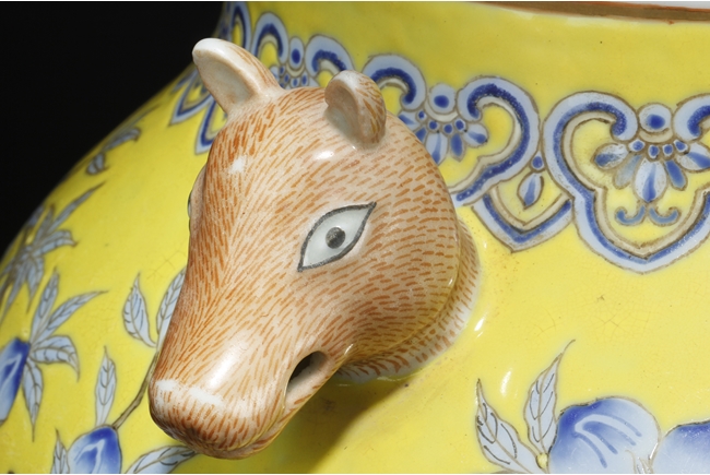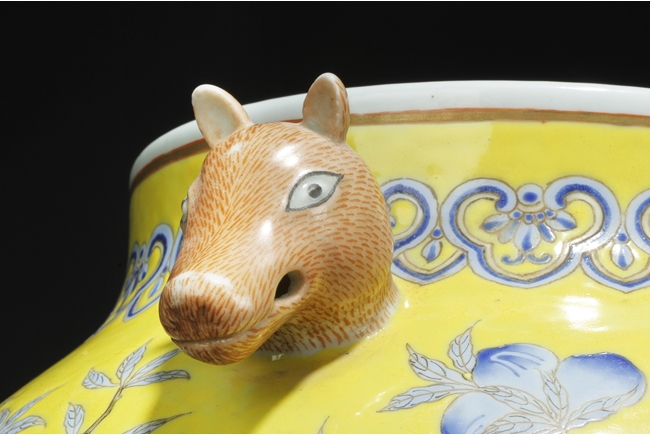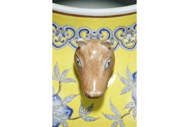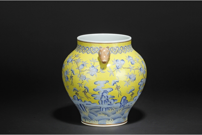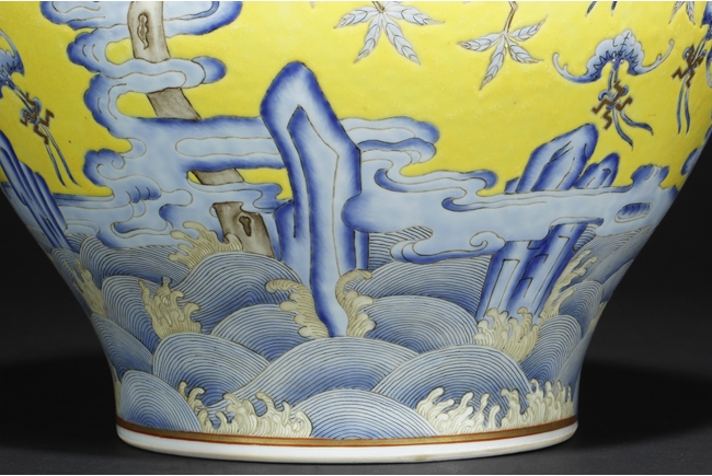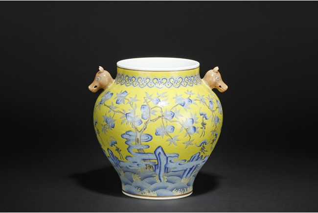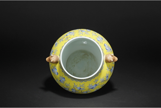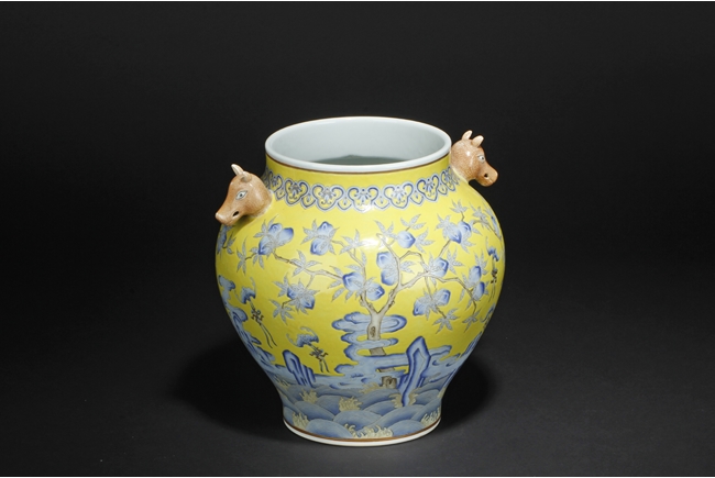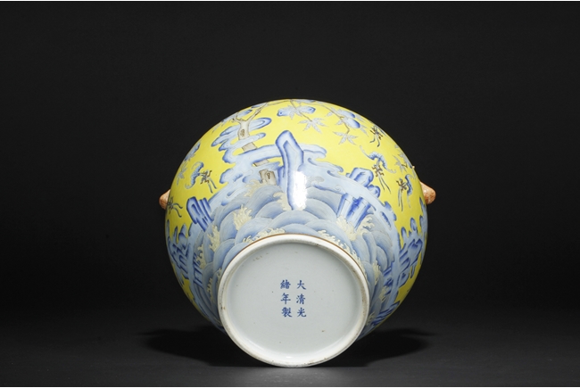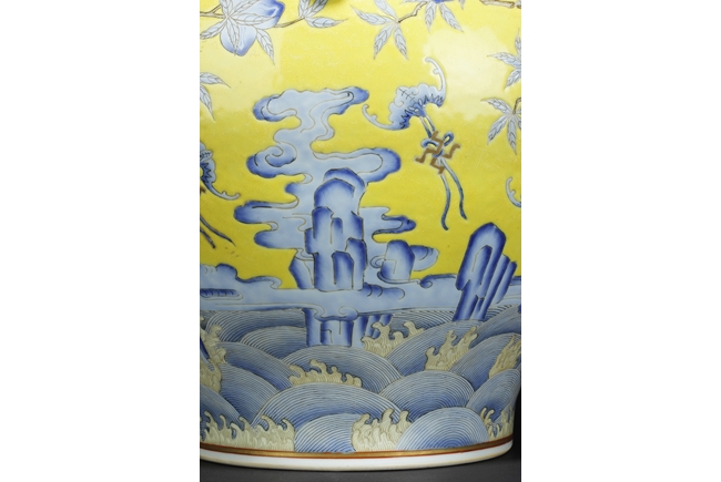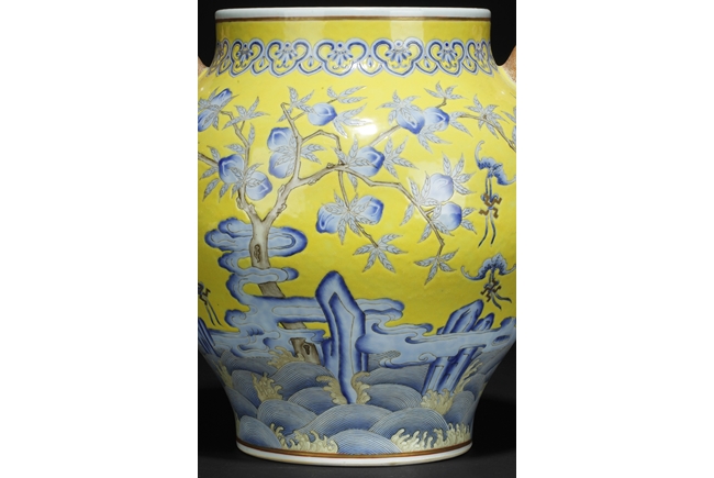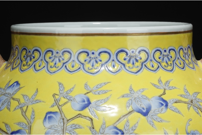 Of baluster form, the jar’s exterior painted with celestial peach trees amidst ocean waves and clouds, surrounded by flying bats carrying Wan symbols, below scrolling ruyi-head band, all against yellow ground. A pair of rabbit mask handles on the shoulder of jar. Bottom bears six character “GUANGXU” mark. Qing Dynasty period