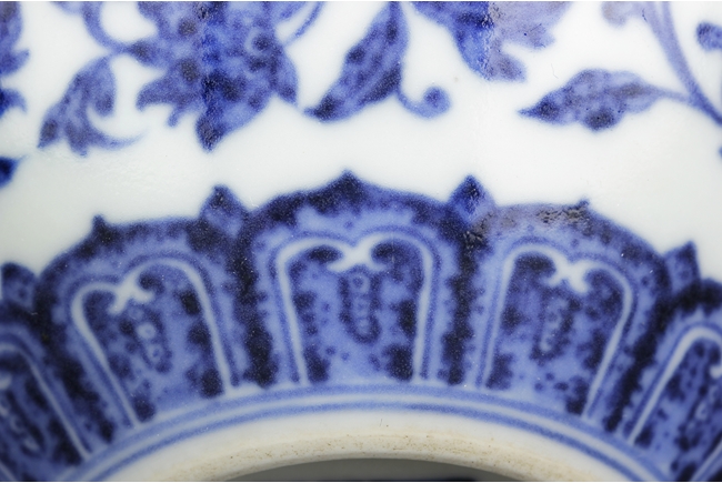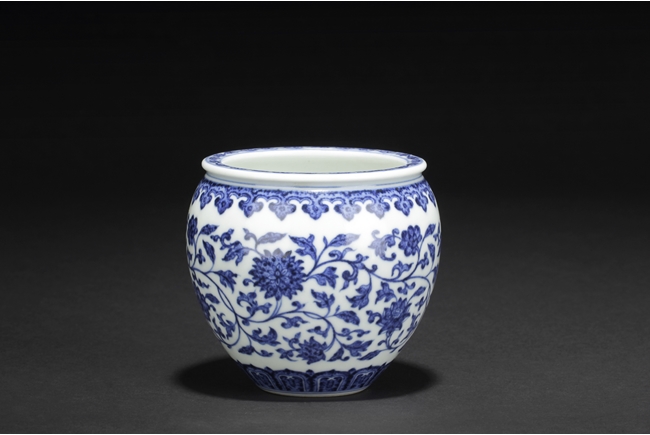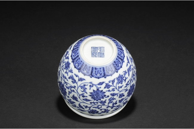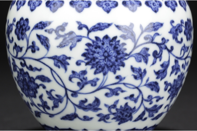 Of globular form, the jar’s body painted with blossoming peony flowers amidst vines and leaves, above scrolling banana leaves pattern and below scrolling lappet band. The bottom with six characters “QIANLONG” mark. Qing Dynasty period
