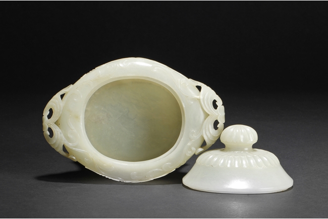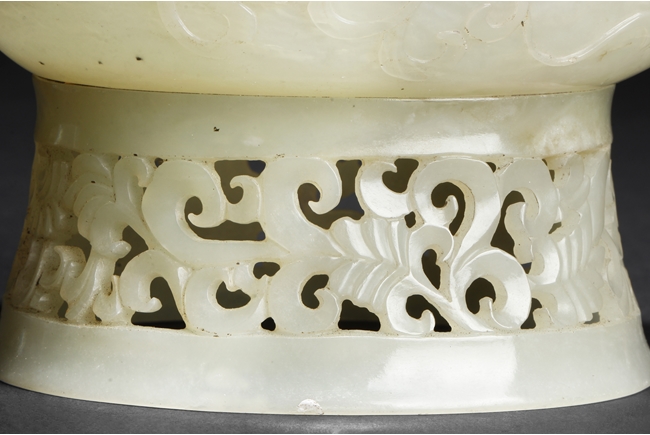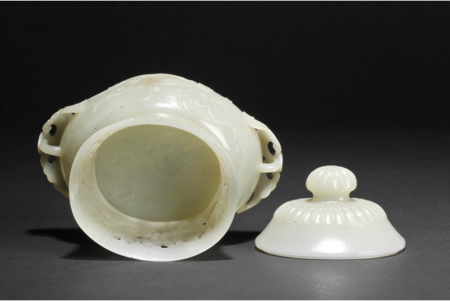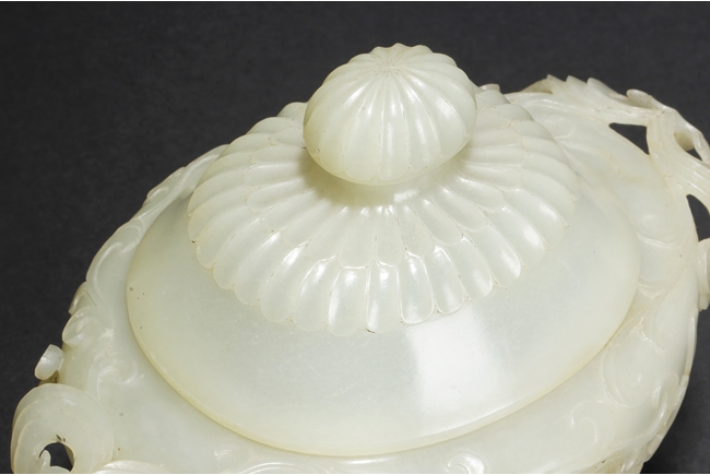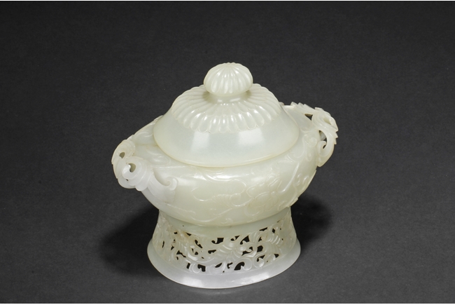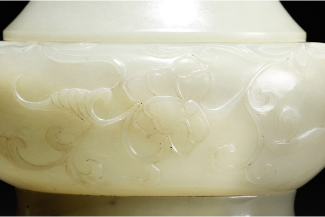 The white jade of creamy white color with translucency, with small russet areas. The censer’s body of compressed globular form, supported by a pierce carved widening cylindrical foot ring, the body lightly carved with flowers and vines, the two looped handles extend outward from the flat shoulder, the lid and finial in chrysanthemum flower petal form. Includes wood carved base. Qing Dynasty period