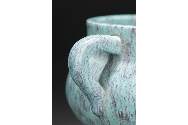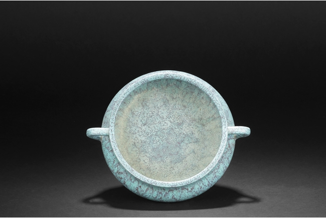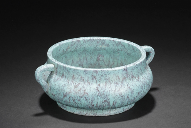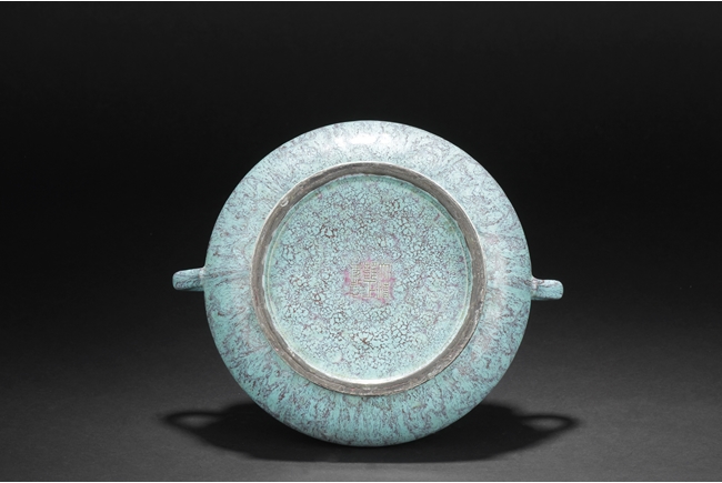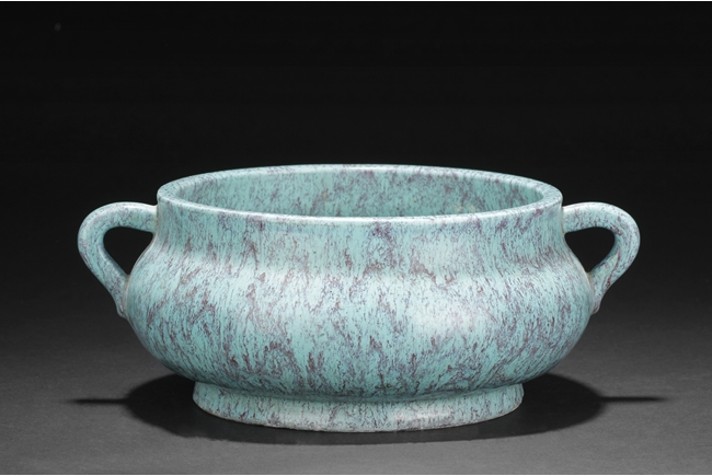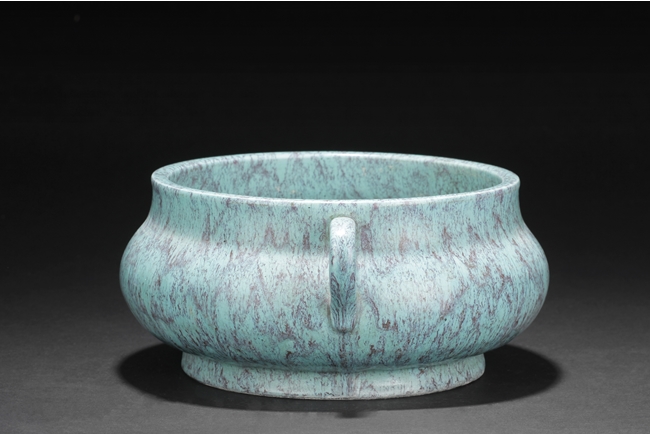 Of flattened ovoid form, the body covered overall with beautiful robin’s egg glaze, body with a pair of looping handles, and bottom bears six character “YONGZHENG” mark. Qing Dynasty period