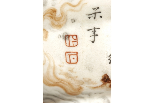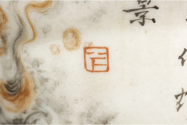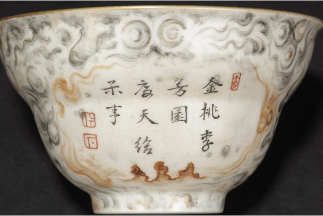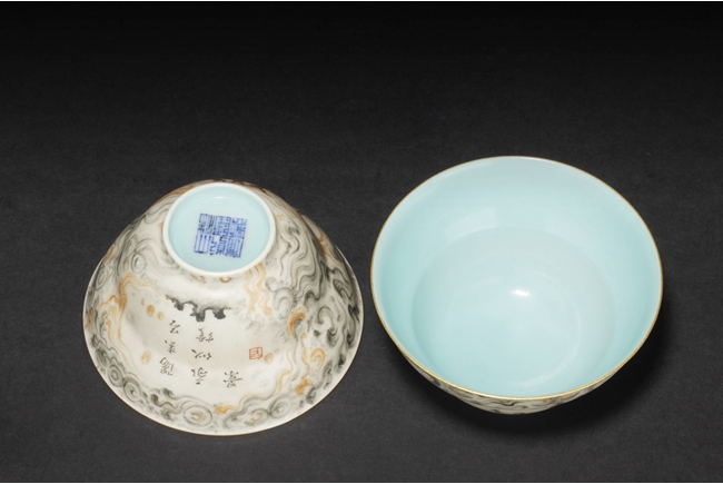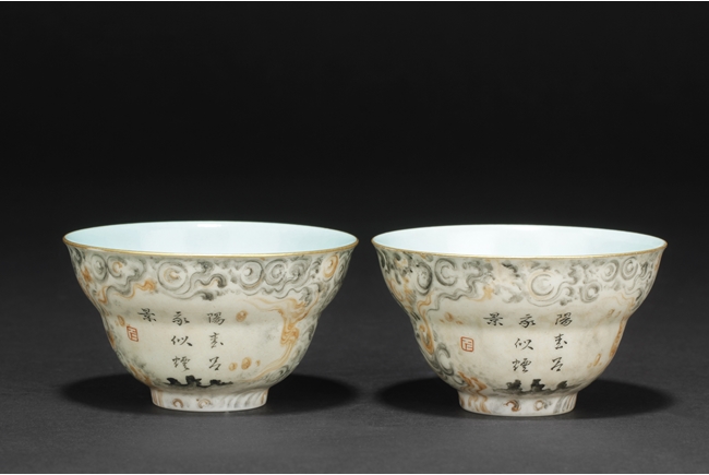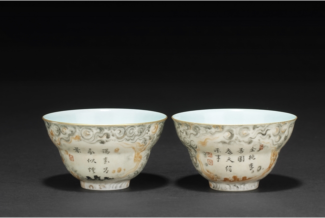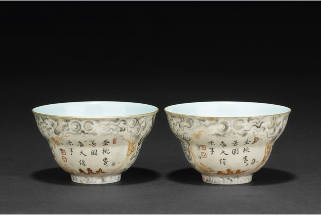 The cups each with two panels of poems, surrounded by cloud patterns, the inside with teal glaze, and the rim with gilt. Bottom bears six character “QIANLONG” mark. Qing Dynasty period