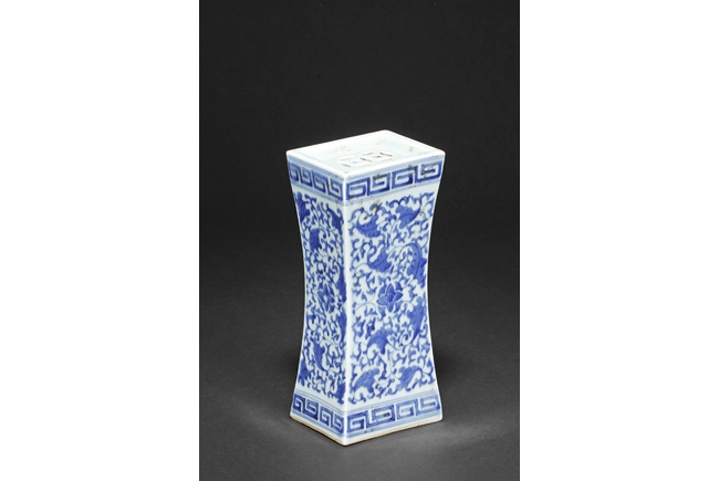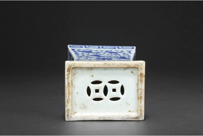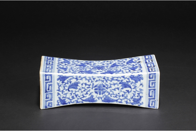 Of waisted rectangular form, the small pillow’s exterior painted with intertwining flowers, leaves, and branches, flanked by key-fret patterns on both ends, each bottom with double coin symbol. Qing Dynasty period