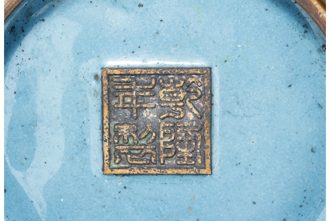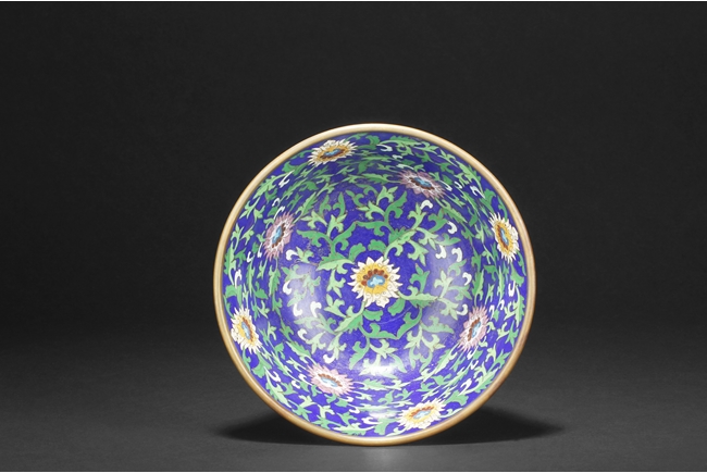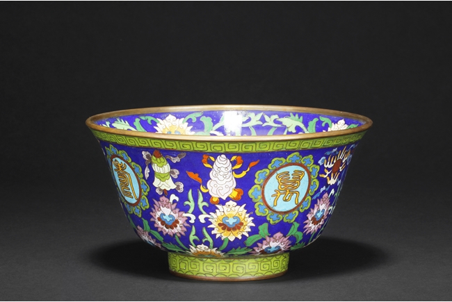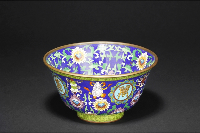 The bowl enameled with blossoming flowers, vines, and leaves, the exterior with four roundels, each enclosing a Chinese character symbolizing longevity, surrounded by ruyi-head patterns, over blue ground, the rim and base with scrolling key-fret patterns. Bottom bears four character “QIANLONG” mark. Qing Dynasty period