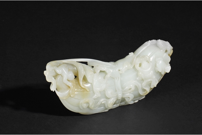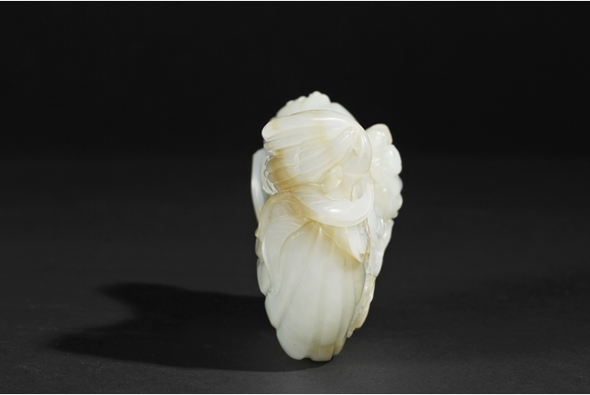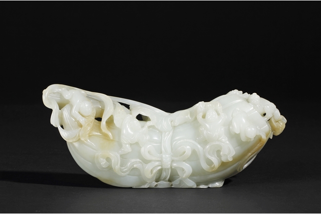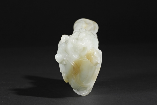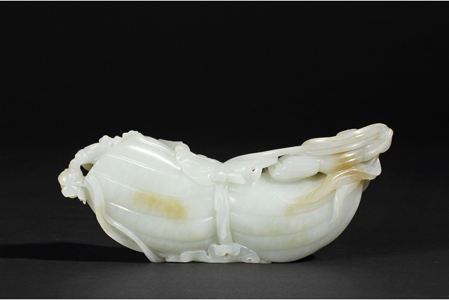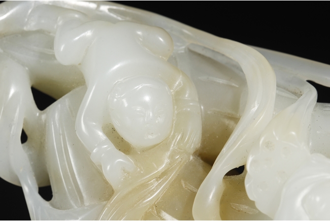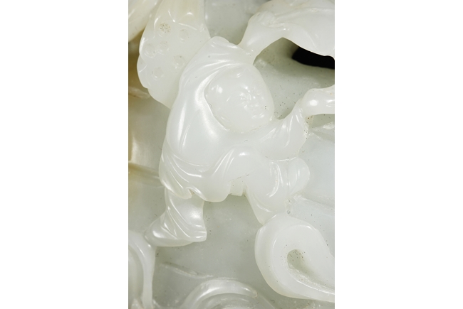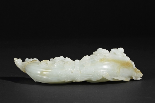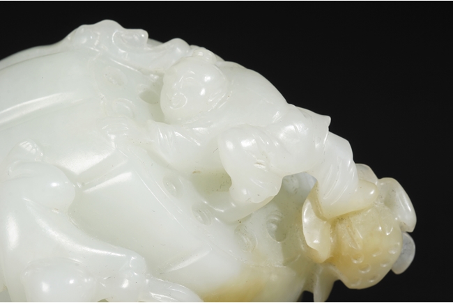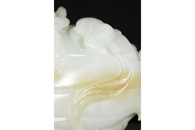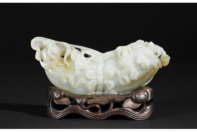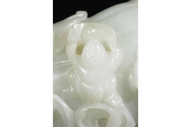 The celadon jade of smooth white color with slight translucency and russet, carved in the form of a large melon, completed with branches and leaves and five children climbed on top in different poses, signifying fortune and luck. Includes original wood carved stand. Republic period