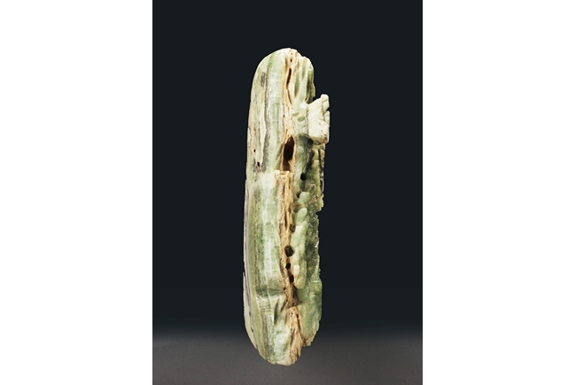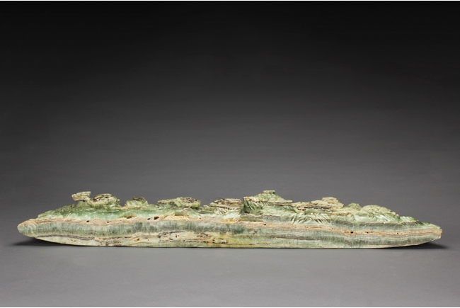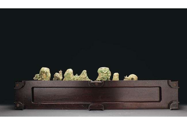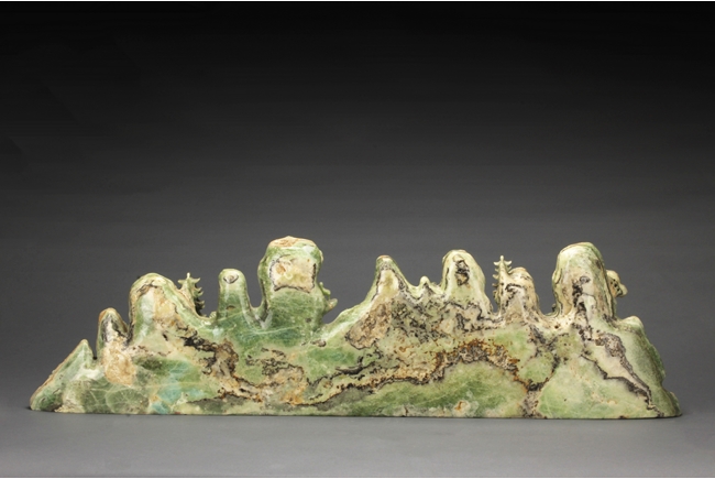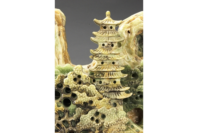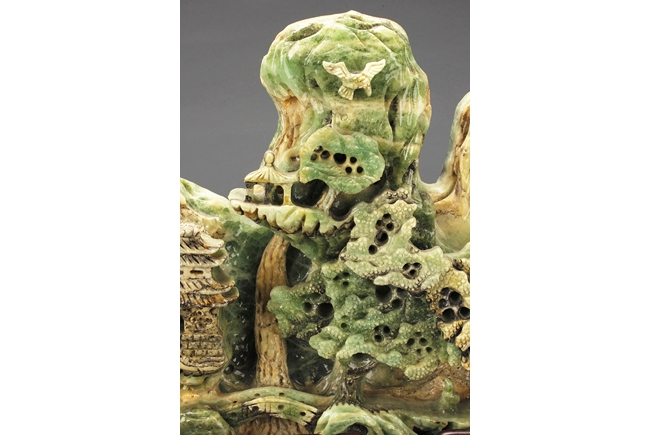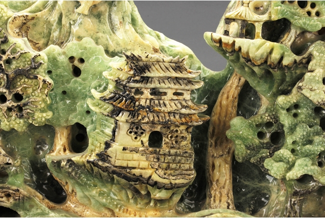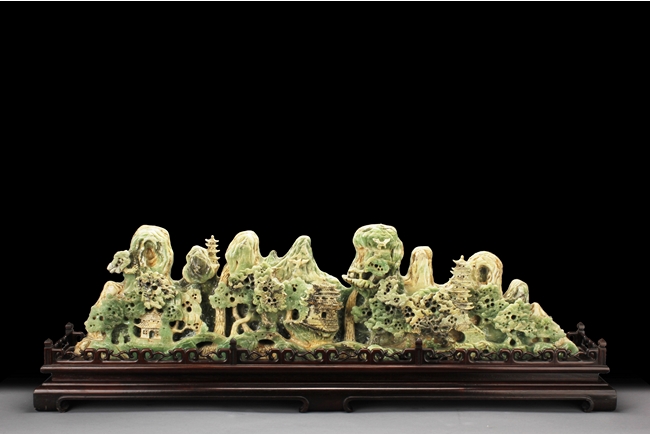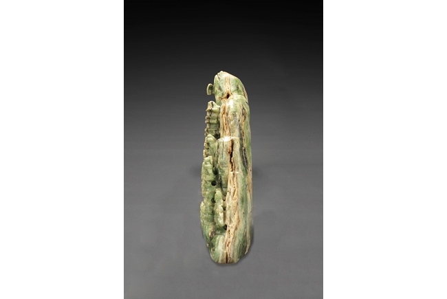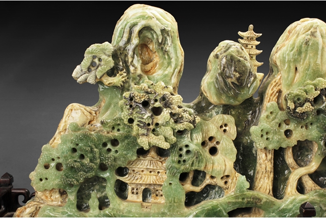 Cleverly carved from a large jade stone, the figural group depicts a landscape scene with mountains, trees, villages, and pagodas, pavilions, and bridges, utilizing green part of stones for trees and mountains, while other colors for structures. Comes with wooden base. Qing Dynasty period