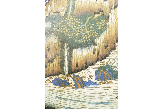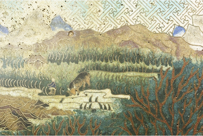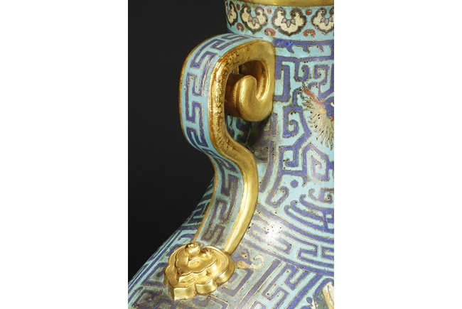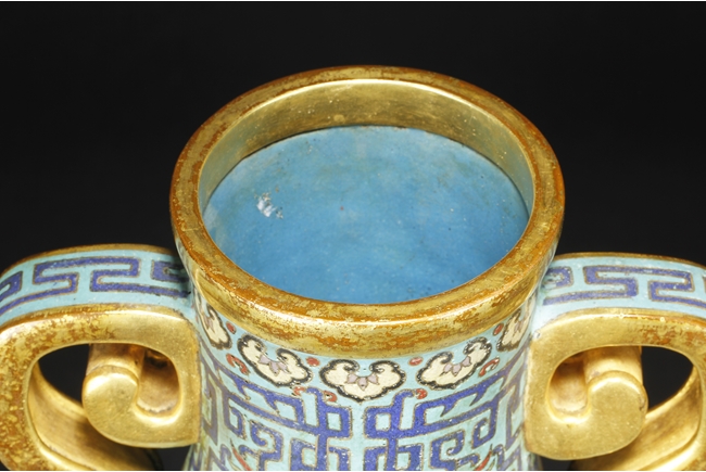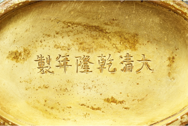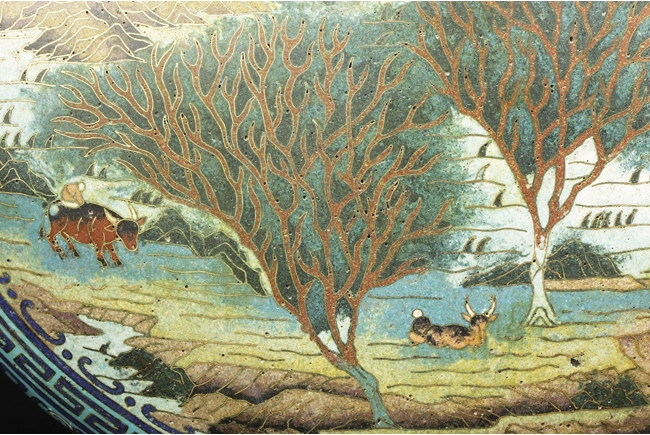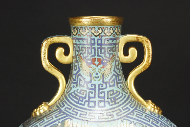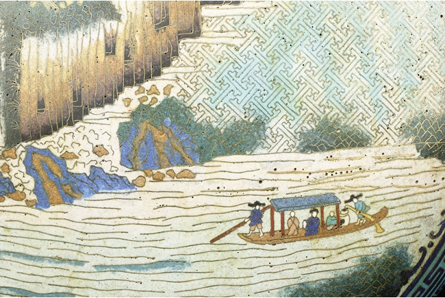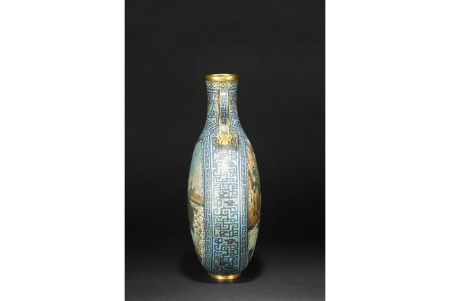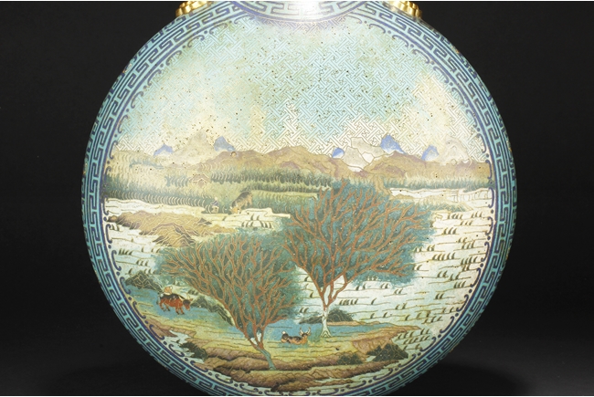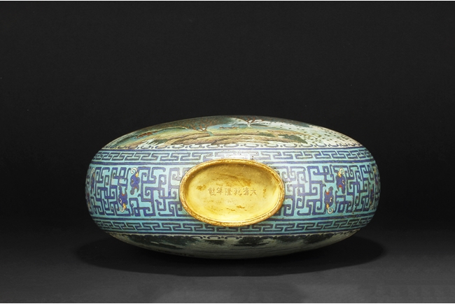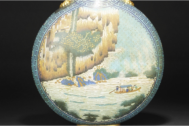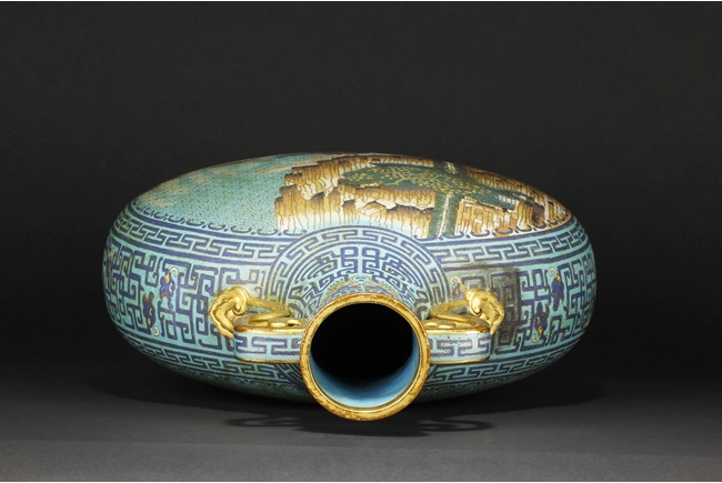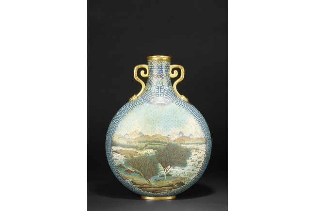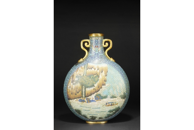 Of flattened ovoid form, the moon-flask with one roundel on each side, one depicts a small boat full of people traveling across river stream near tall cliff and trees, the reverse depicts a river and mountain scenery, with three young boys each herding a water buffalo near the river and under trees, the sides with elaborate dragon patterns, the neck with confronting phoenix, below scrolling ruyi band pattern near the rim, the gild handles curved gracefully, attached to the body and neck, with additional gild on the rim, base, and background. Bottom bears six character “QIANLONG” mark. 19th century