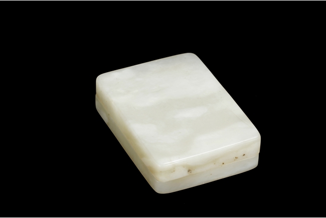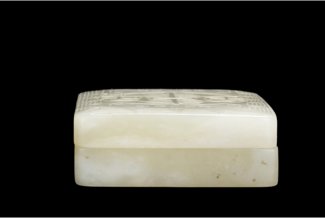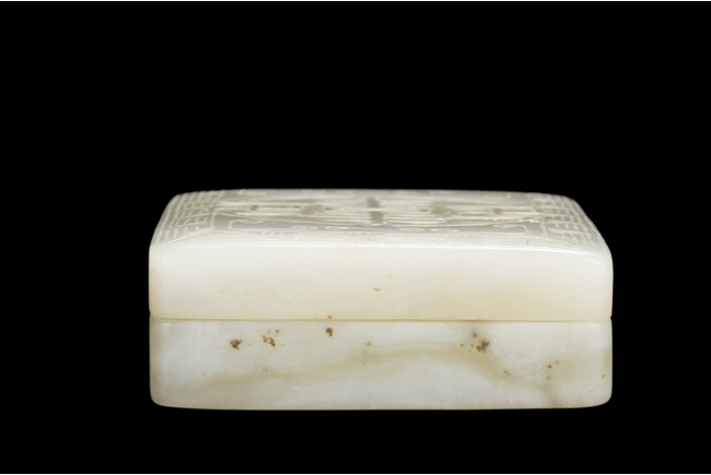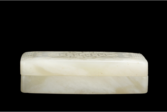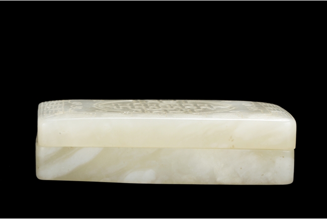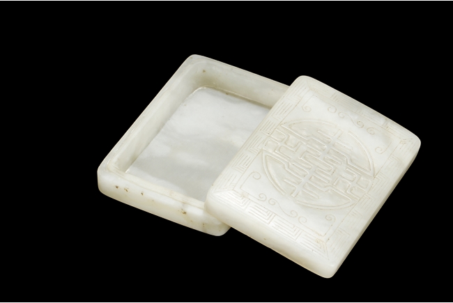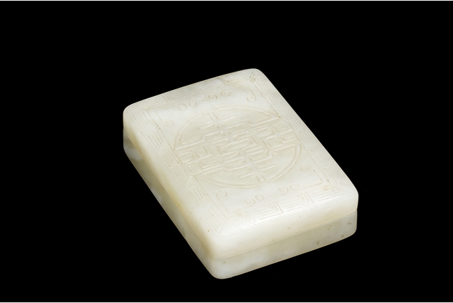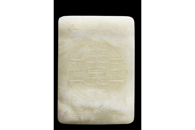Of rectangular form, the lid low relief carved with Chinese character “Shou” in a roundel, symbolizing longevity, the edge carved with angular line patterns; inside and the back remain uncarved. Early Republic period