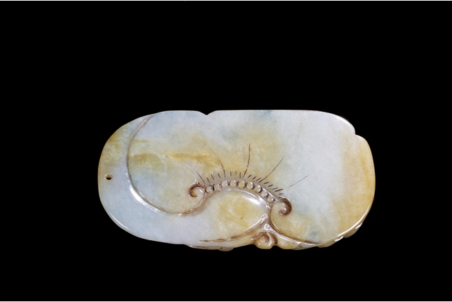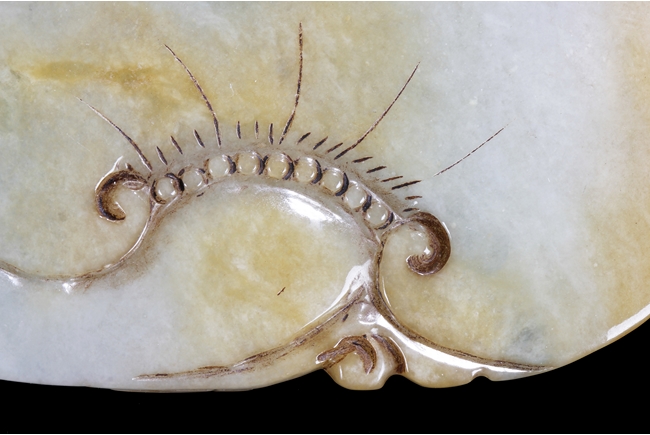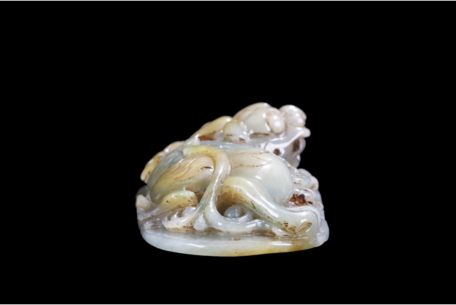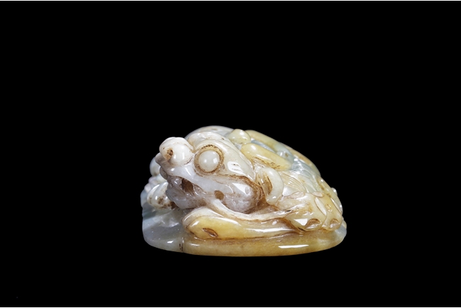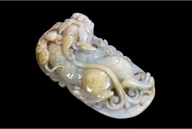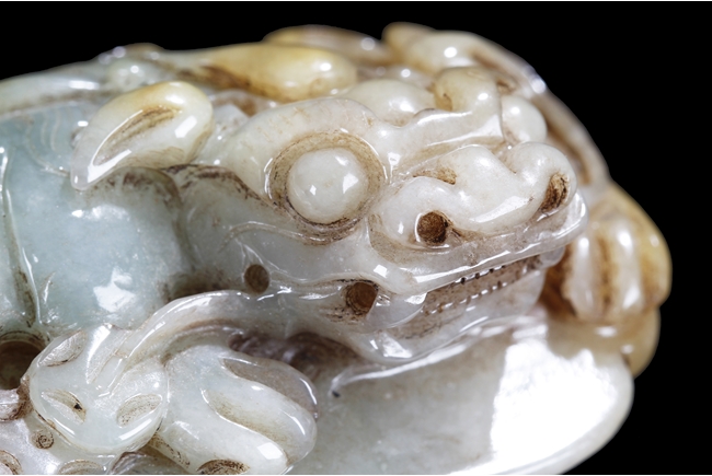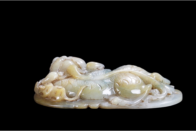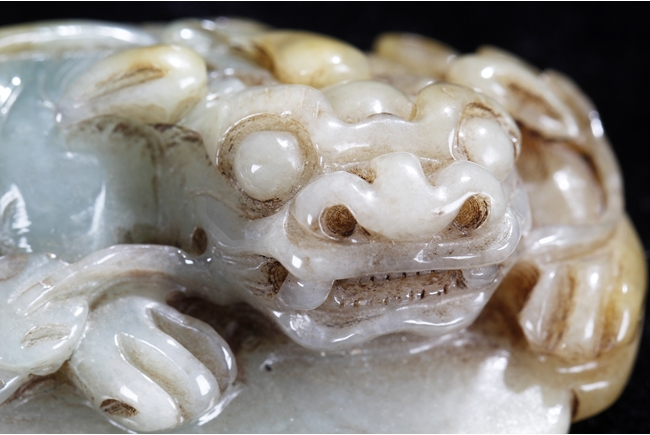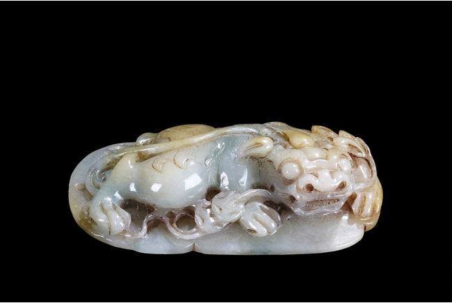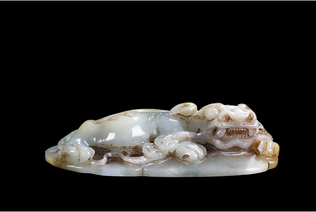The lion with all four paws and body reclining on the ground, biting on a string of Chinese coins, a single long horn extends from the back of the head all the way past the tail with wide-openned eyes. The stone of white with translucency, small areas of russet, and blueish-green inclusions. Qing Dynasty period