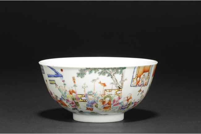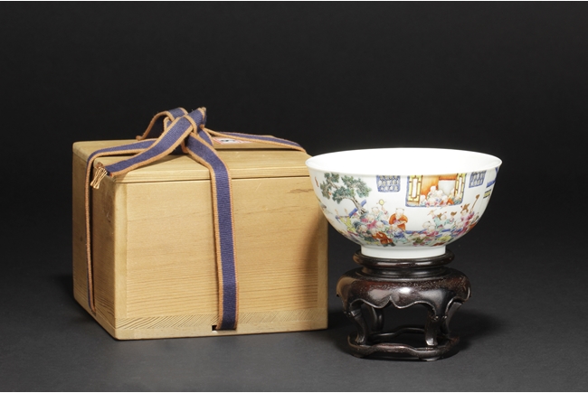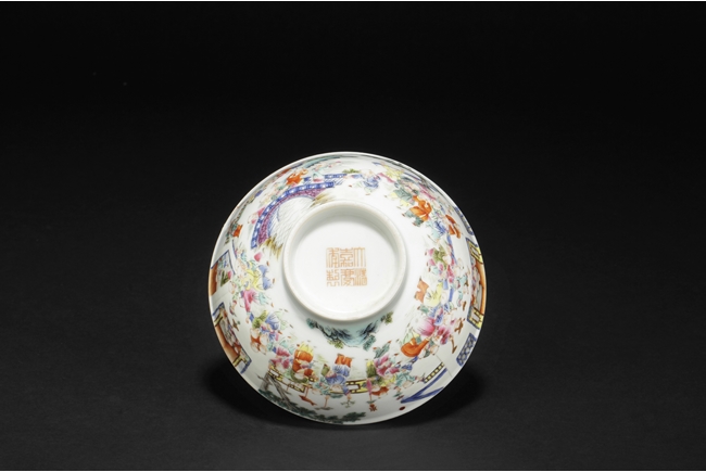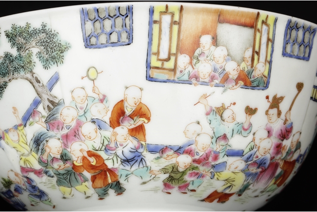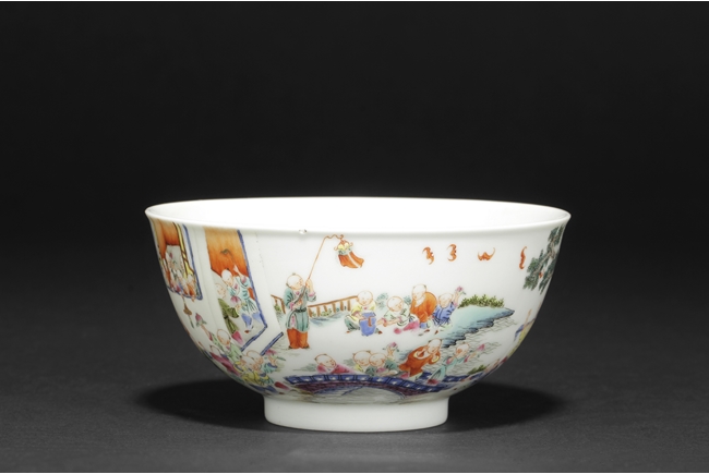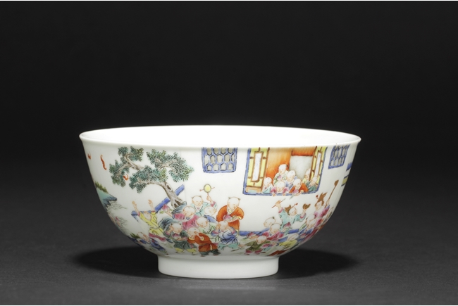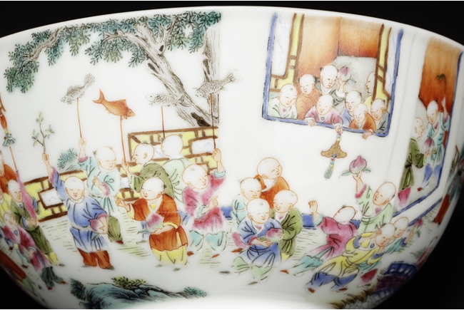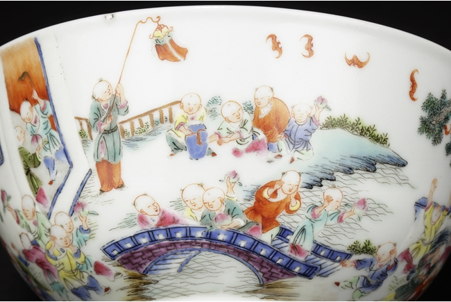 The exterior painted with many children playing various games within a backyard garden setting, symbolizing fortune, longevity, and fertility. Bottom bears six character “JIAQING” mark. Qing Dynasty period