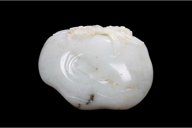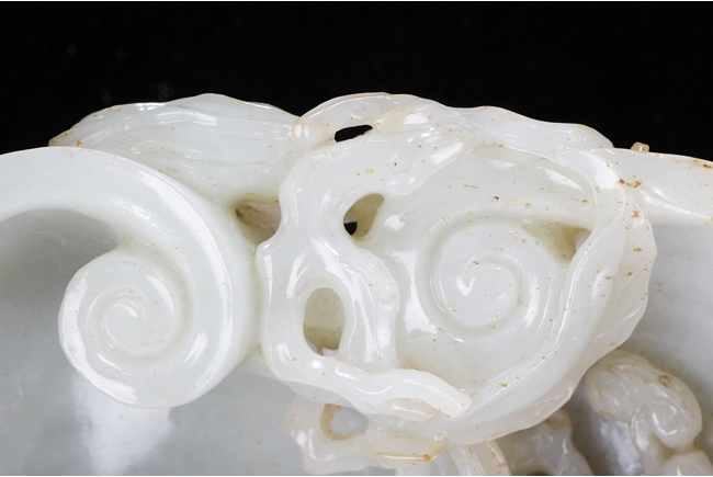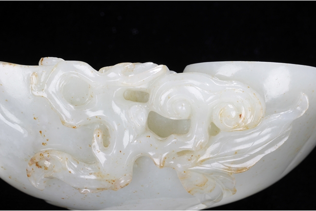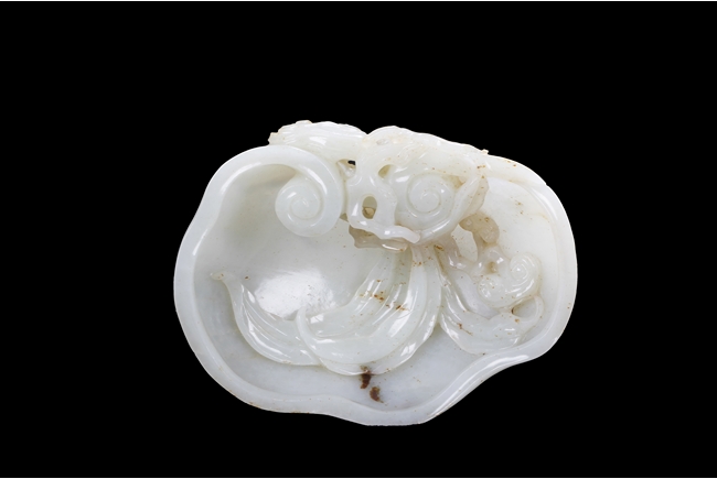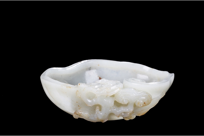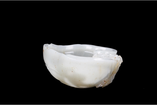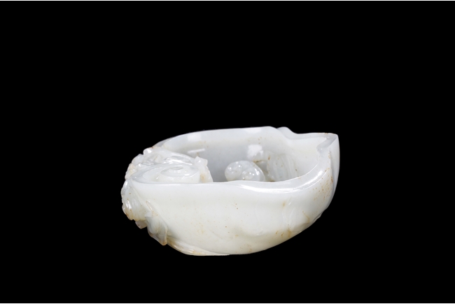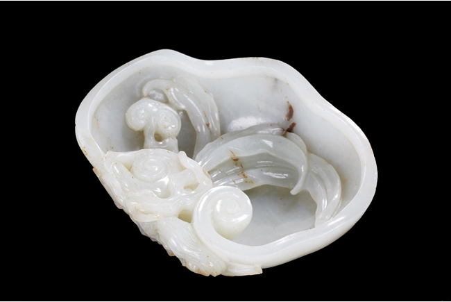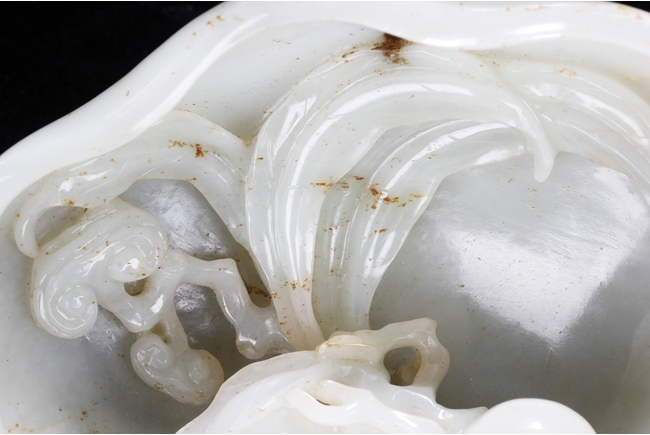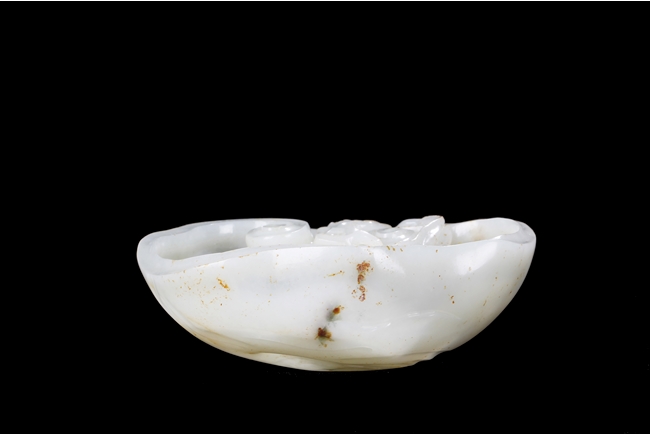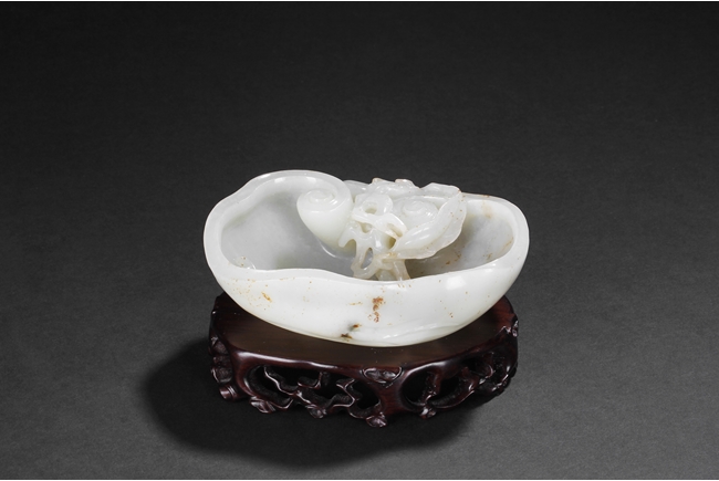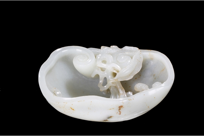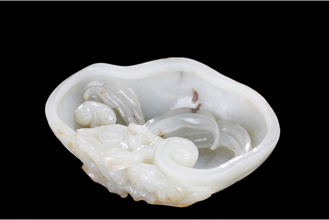 The washer’s interior and side carved with ganoderma lingzhi, complete with branches, roots, and leaves surrounding them. The stone of white with translucency, and slight russet. Qing Dynasty period