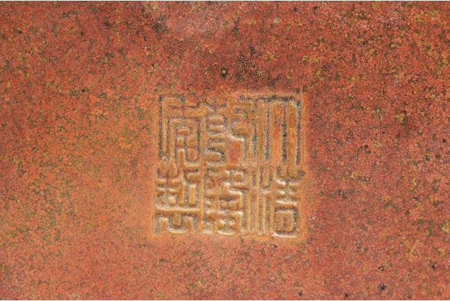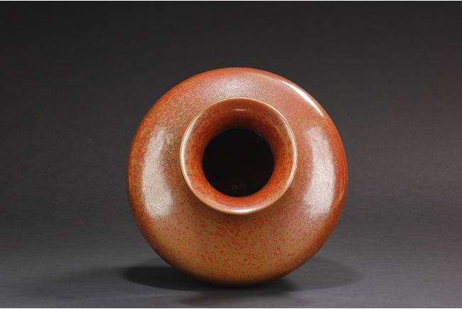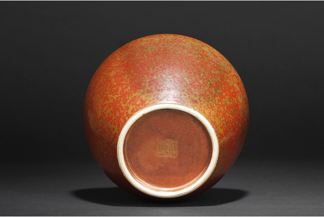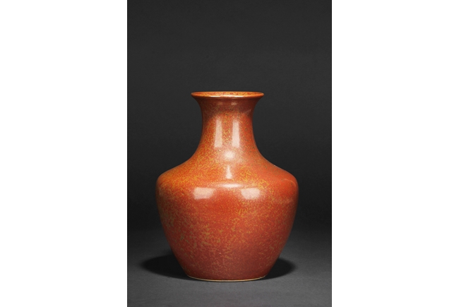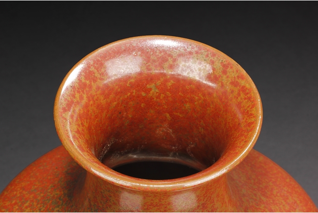 Of baluster form, the vase’s exterior covered in rich mottled orange-red glaze, the flaring rim opens wide, showing similar style glaze inside. Bottom bears six character “QIANLONG” mark. Qing Dynasty period