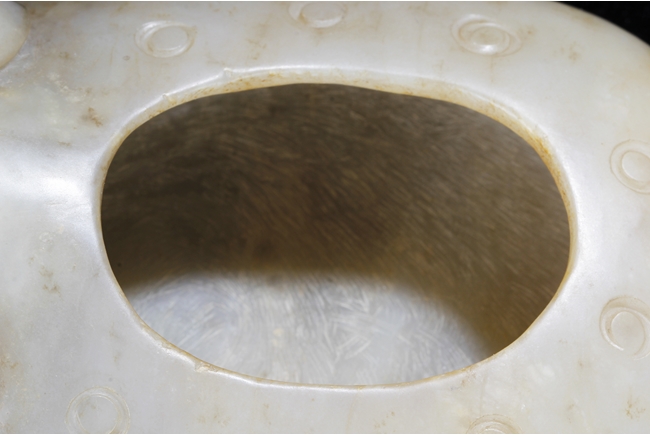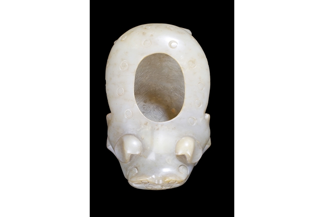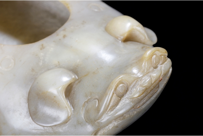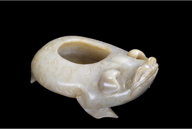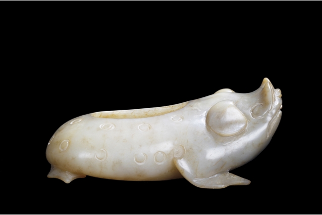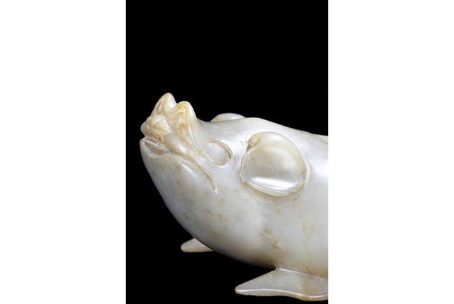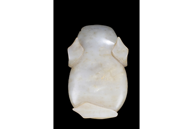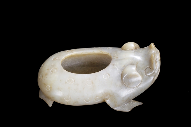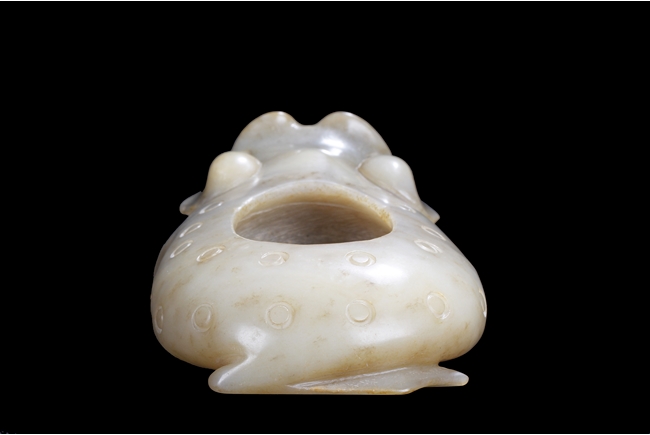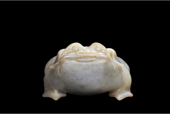 In the form of a frog, the washer relief on the body with small round patterns, supported by bent frog legs, the front with frog’s head slightly raised. The stone of grayish-white, with small russet areas. Qing Dynasty period