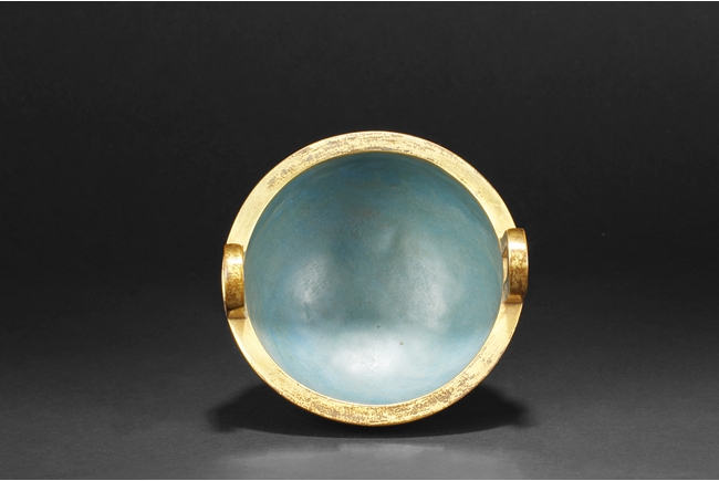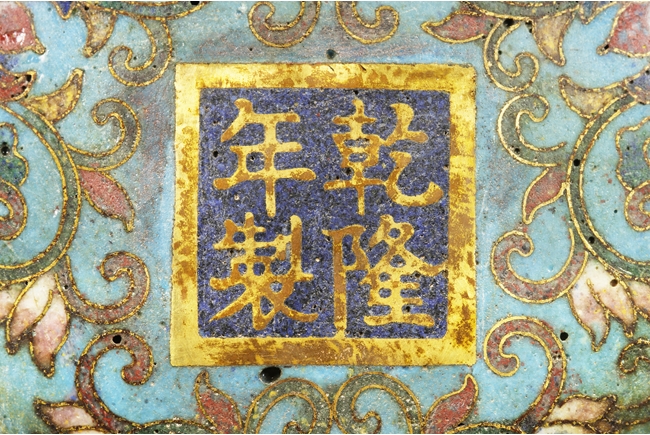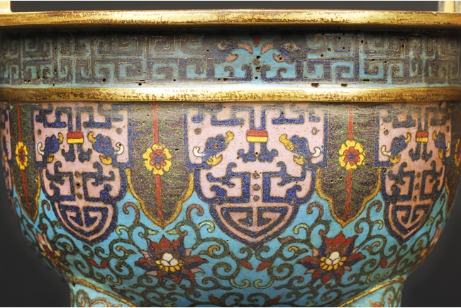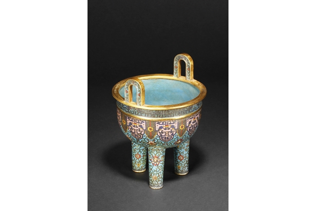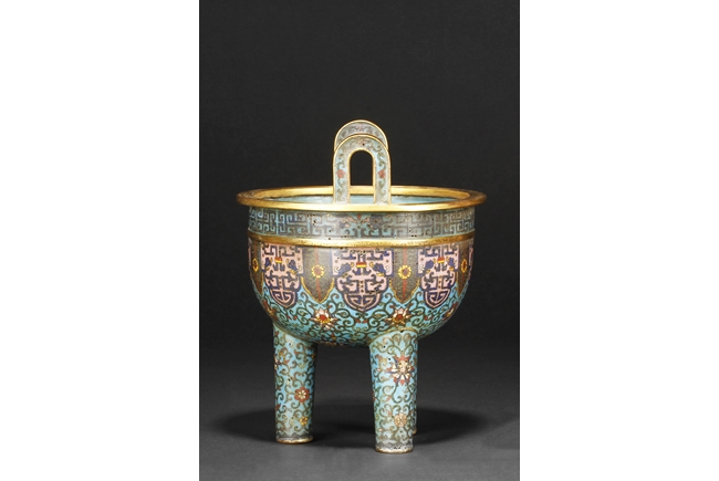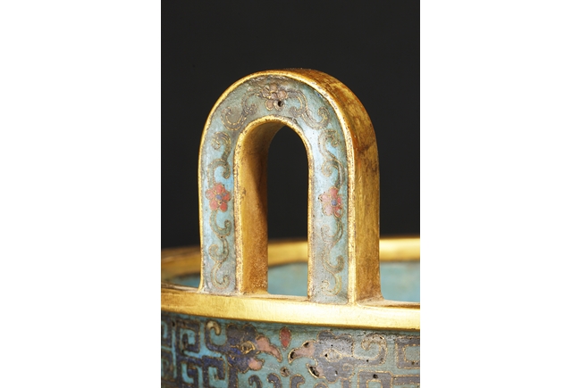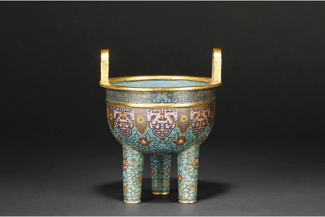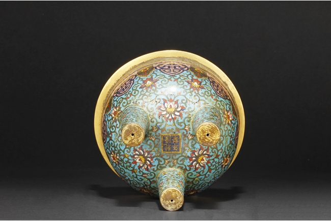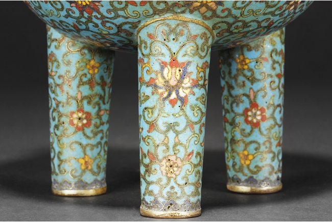 Of bulbous form, the censer supported by three long legs with flowers and vines patterns, extending to the body below scrolling banana leaves pattern, and additional scrolling phoenix and key-fret patterns below the rim, the two arching raised handles attached to the top of rim. Gild on the bottom of feet, part of body, the rim, and the handles. Bottom with four character “QIANLONG” mark. Qing Dynasty period