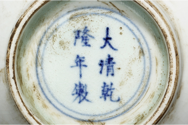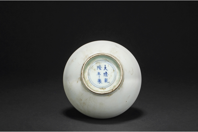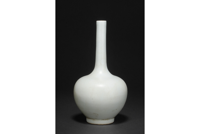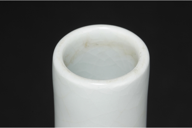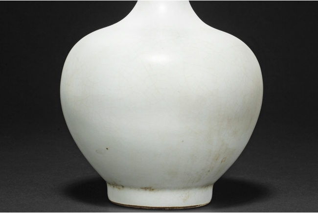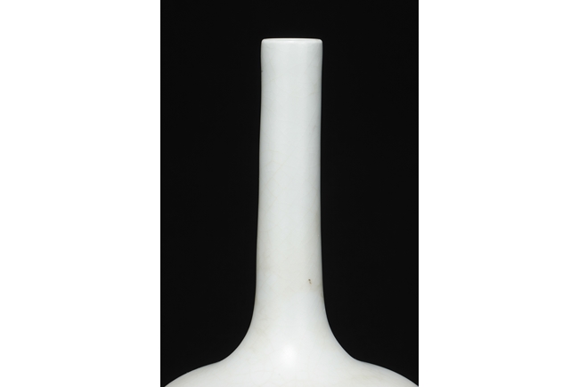 The body of globular form, supported by a straight foot ring, the neck of long, straight, and slender form, covered overall in smooth white glaze, with crackle-ware pattern slightly visible on the exterior. Bottom bears six characters “QIANLONG” mark.