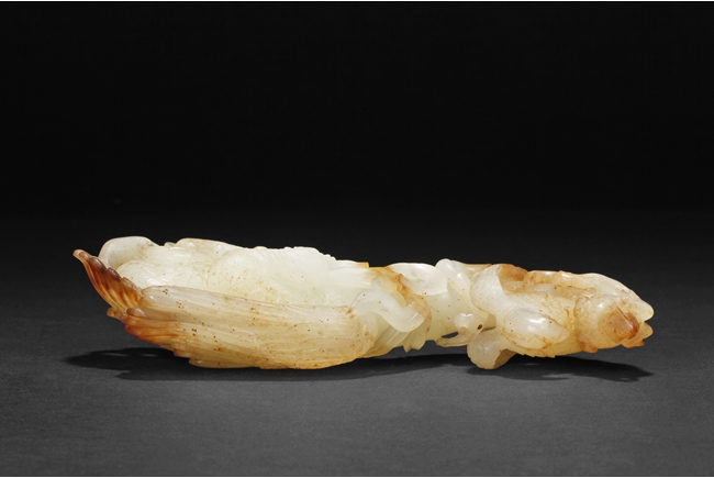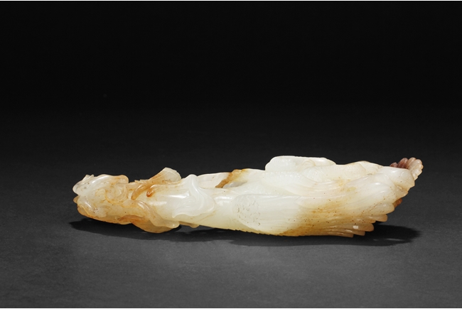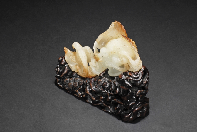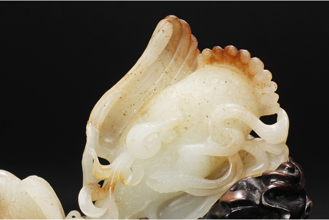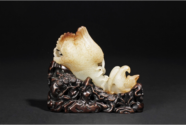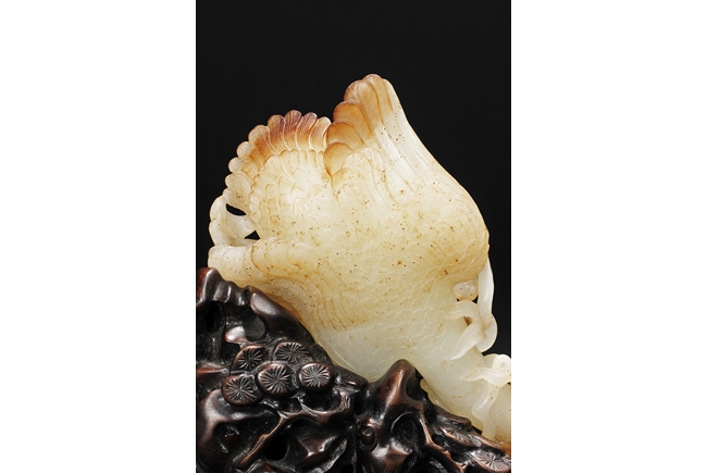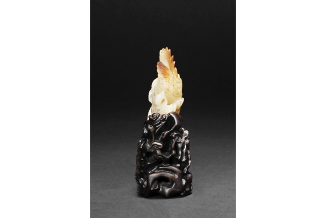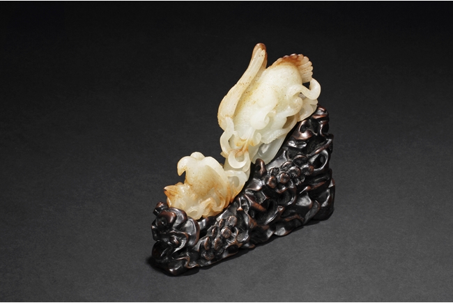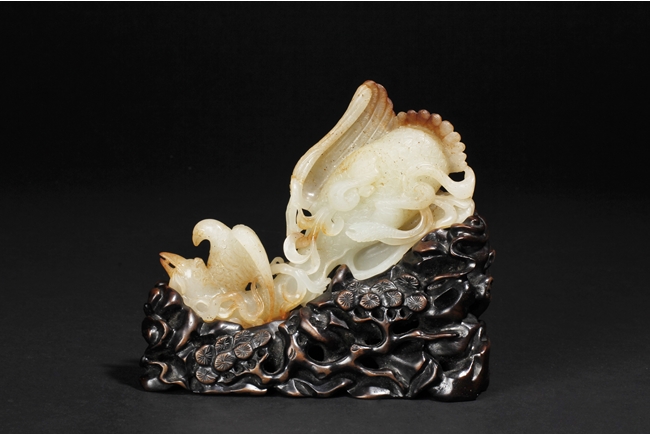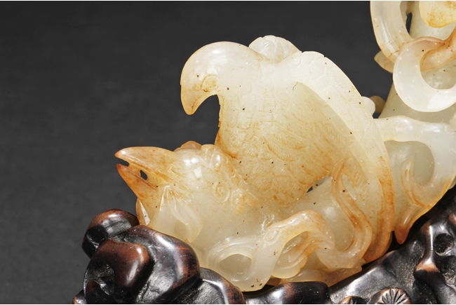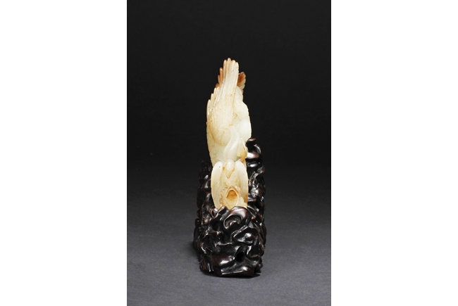 The brush rest carved in the form of a phoenix and a bird, the Hetian jade of white and semi-translucent color with sporadic russet, including original wooden carved stand in the form of rock-works and pine trees. 19th century