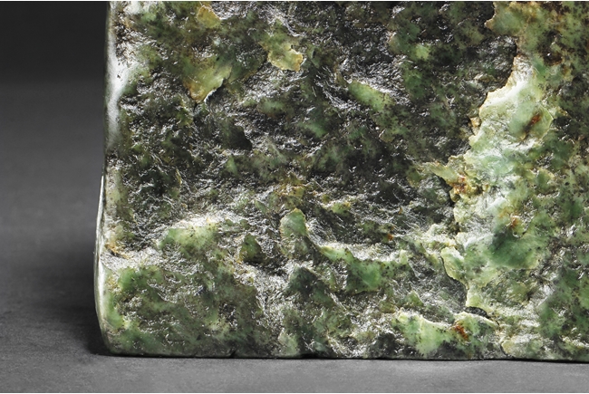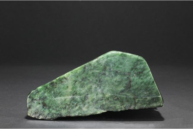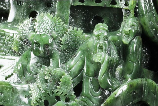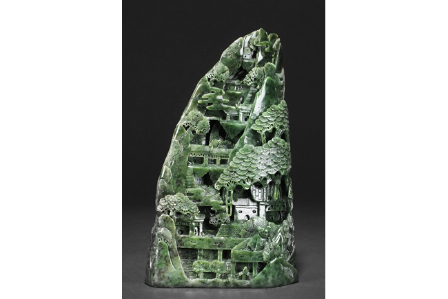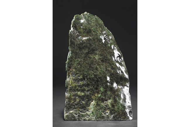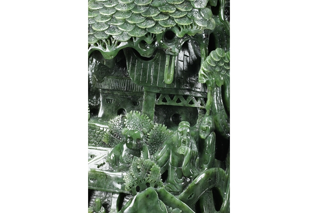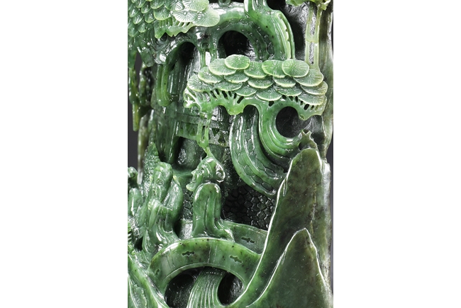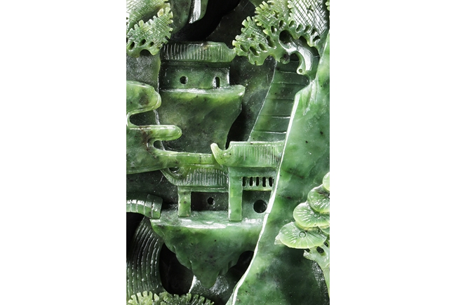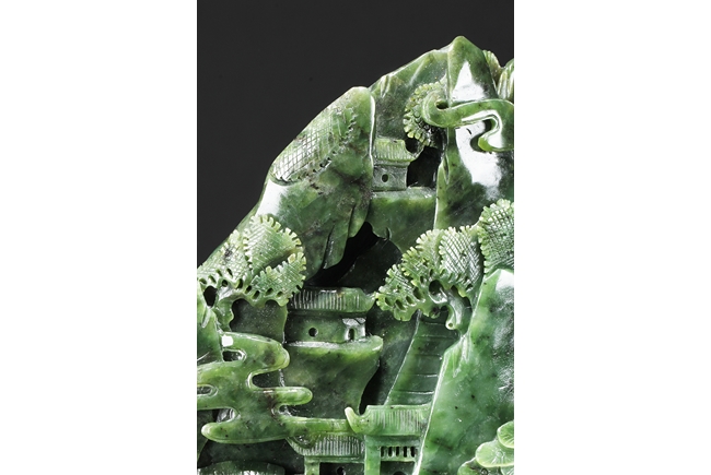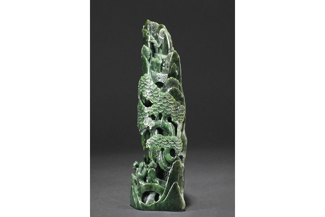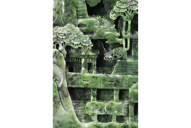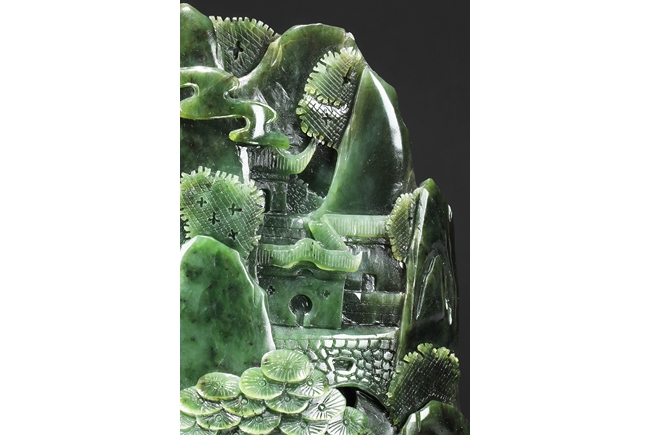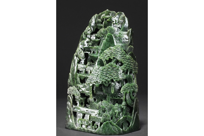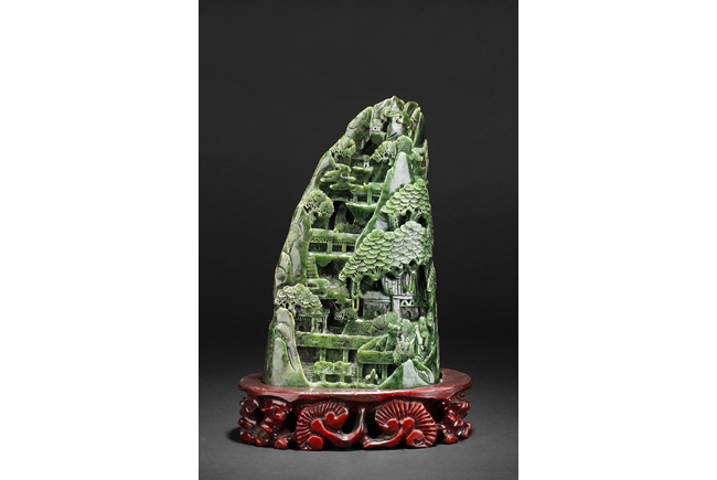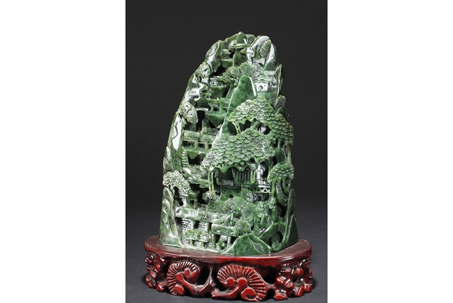 High-relief carved on one side with a mountainous scene depicting hidden temples, small pavilions, and lush pine trees amidst cragged mountain, with three people at the stairway of mountain foothill. The stone with natural mottle green color, with small areas of dark inclusions. Includes a hardwood carved stand. 19th century