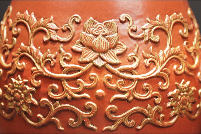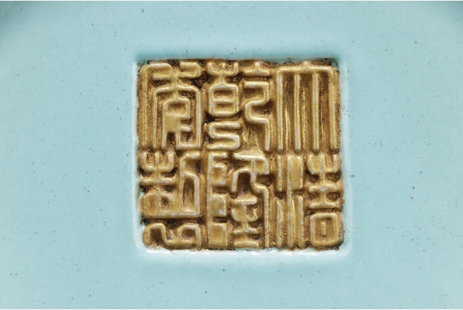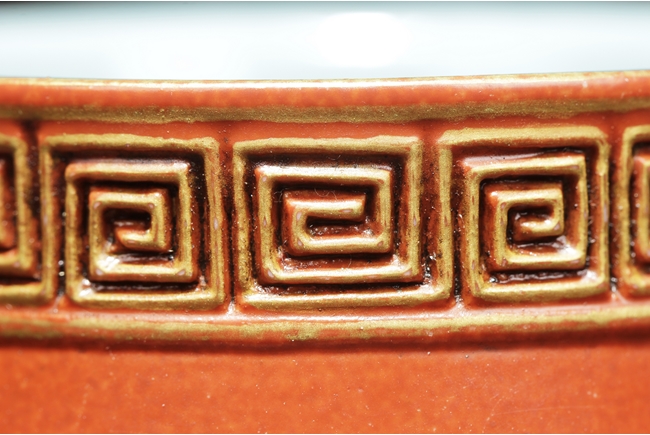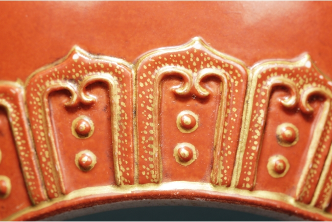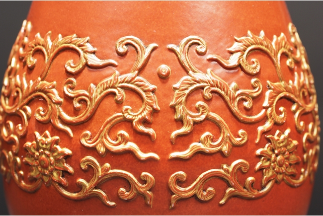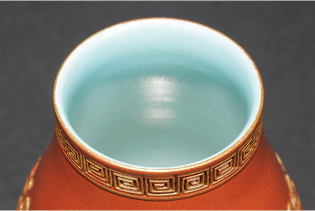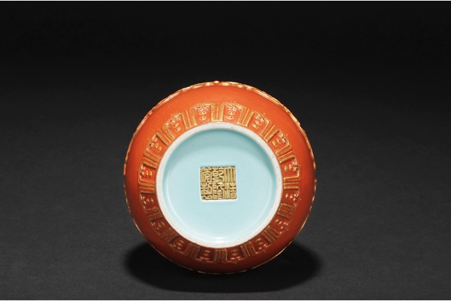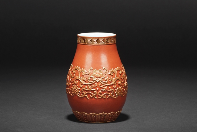 Of bulbous form, the vase’s body with gilt peony flowers and vines over coral red ground, above scrolling lappet band and below scrolling key-fret band, the inside of teal ground. Bottom bears six character “QIANLONG” mark. 19th century