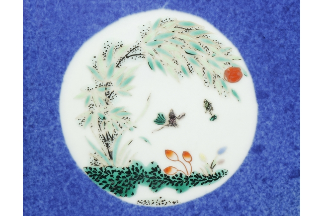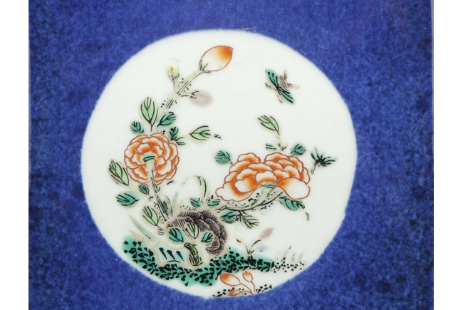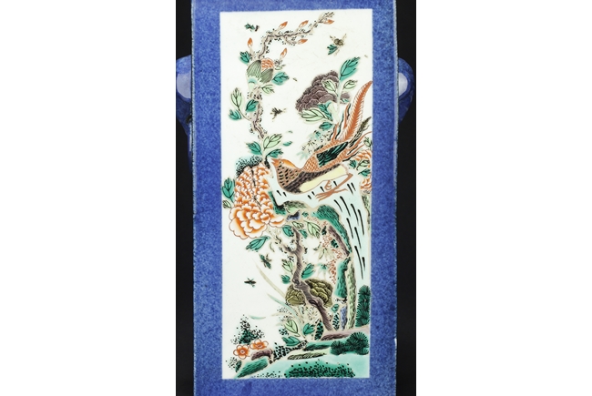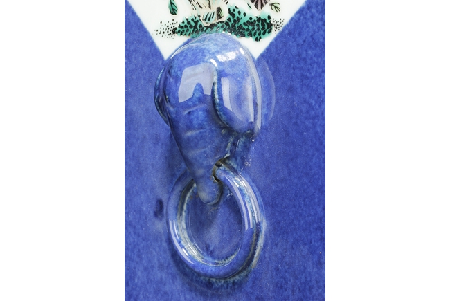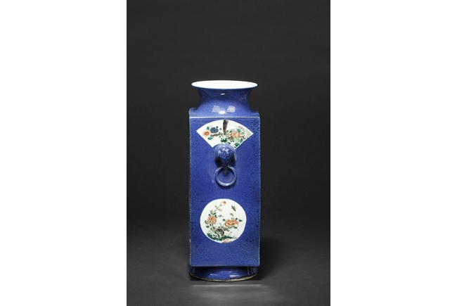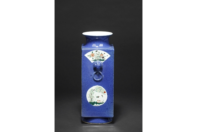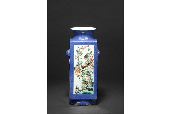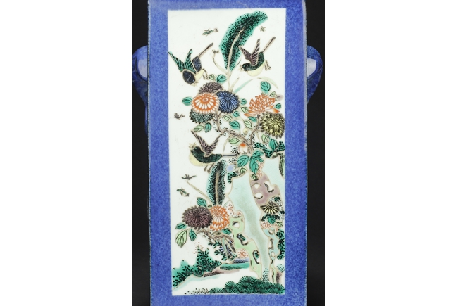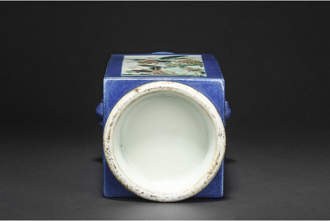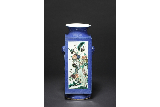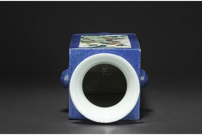 Of rectangular form, the vase supported by a splayed ring foot, the front and back side of the body painted with scenes of birds flying over flowers in the wild, against blue ground, a pair of elephant mask handles on the sides, each with two small paintings of flowers, the waisted neck leads to flaring rim, the interior glazed white. 19th century