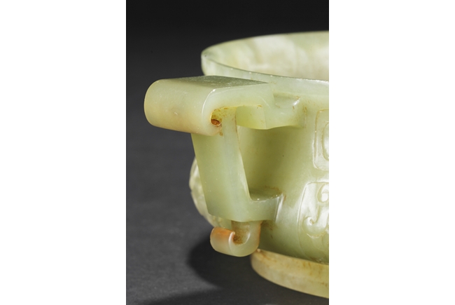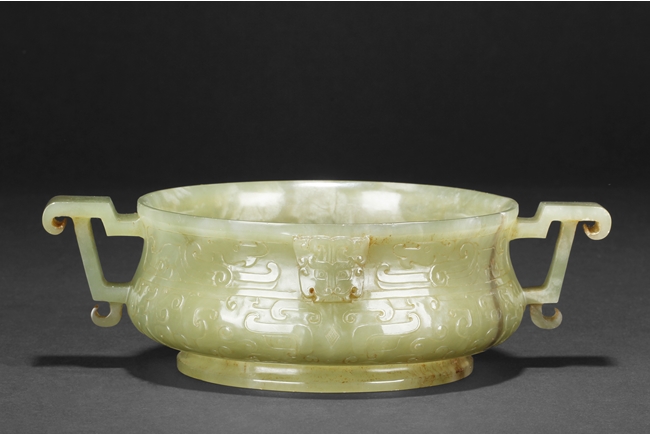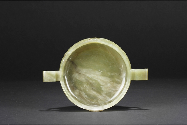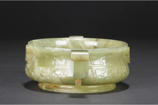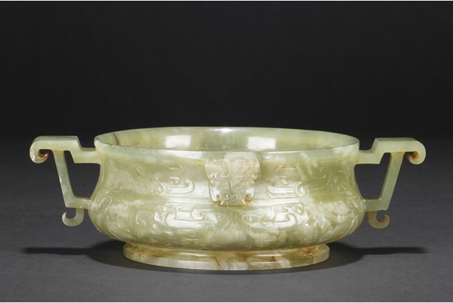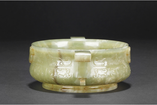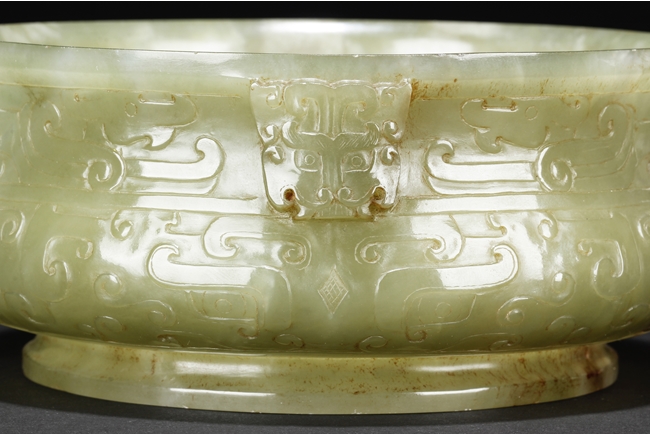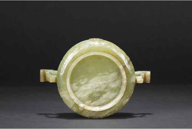 Of flattened globular form, supported by a ring foot, the body finely carved with Taotie masks on front and back, exterior with flying dragons, and the stylized handles with anglular and curved features. The stone of pale grayish-green color, with slight russet and dark inclusions. Early Republic period