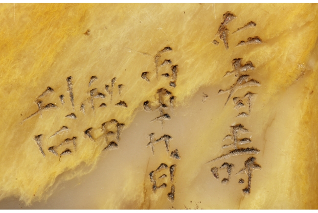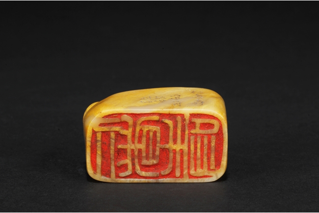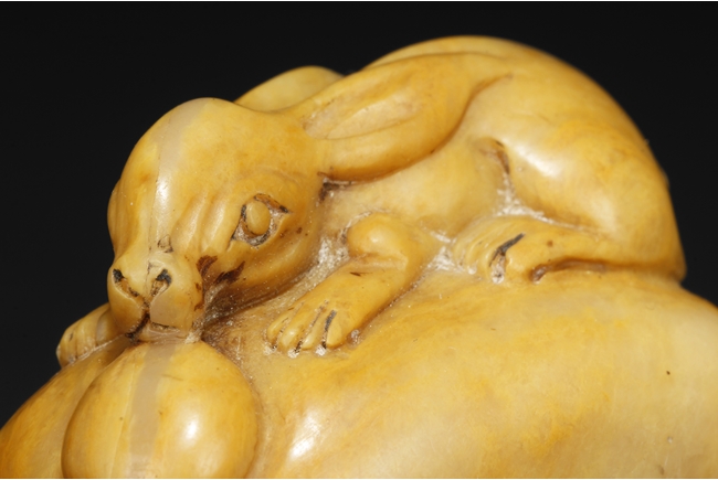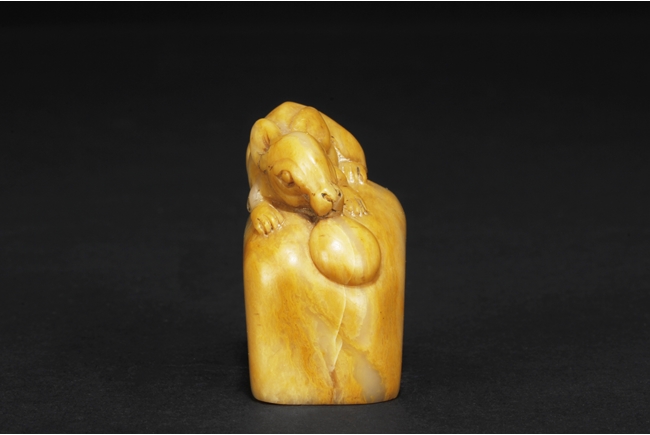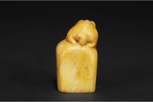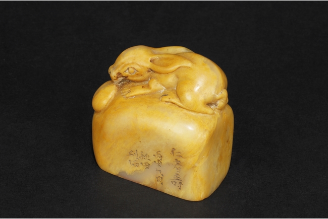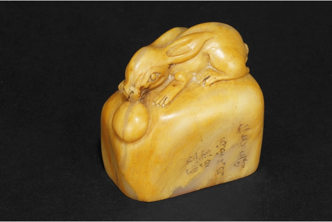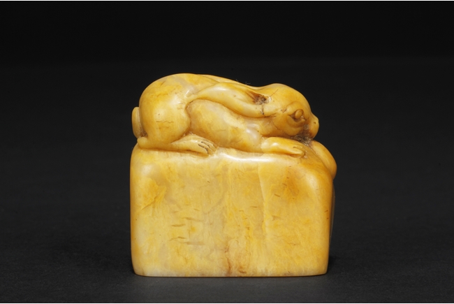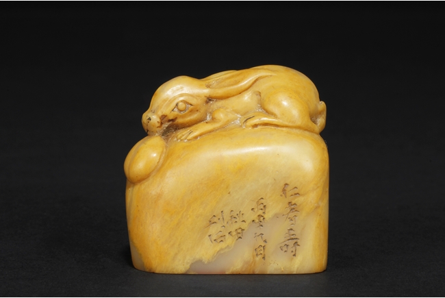 This well-carved Shoushan stone seal is surmounted by a rabbit on top, the stone of rectangular form with yellow and white color, one side carved with Chinese characters, and bottom engraved with seal mark. Some natural fissure visible on the stone. Qing Dynasty period