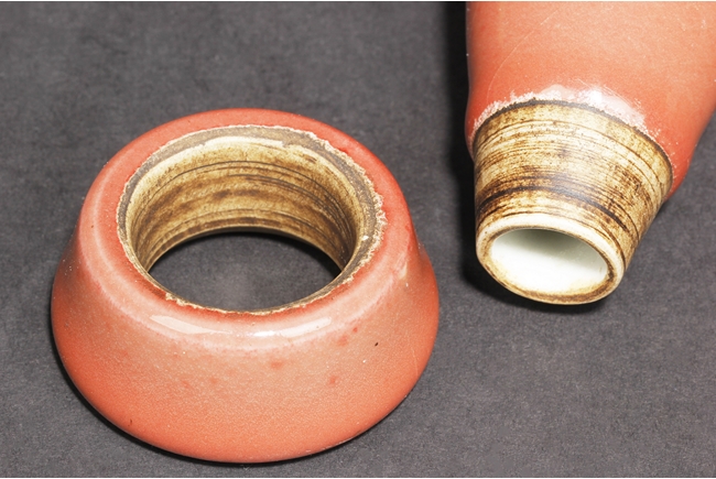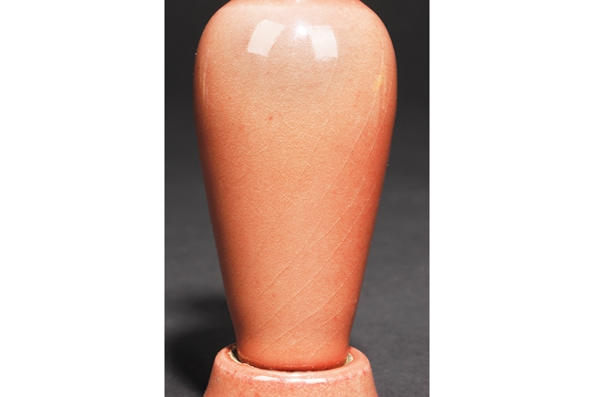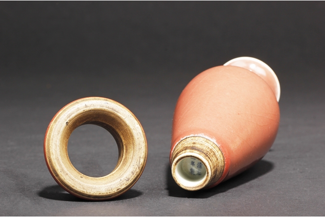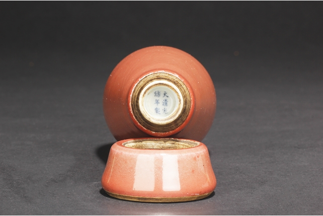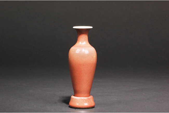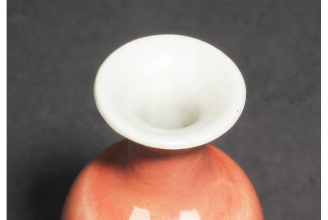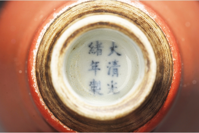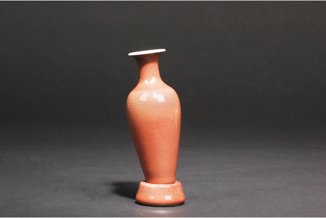 The high-shouldered, tapering body covered with deep copper-red glaze, the inside covered in white glaze, the foot in countersunk style, fitted into an en-suite conical foot ring with inside and bottom unglazed, the vase bottom bears six character “GUANGXU” mark. Qing Dynasty period